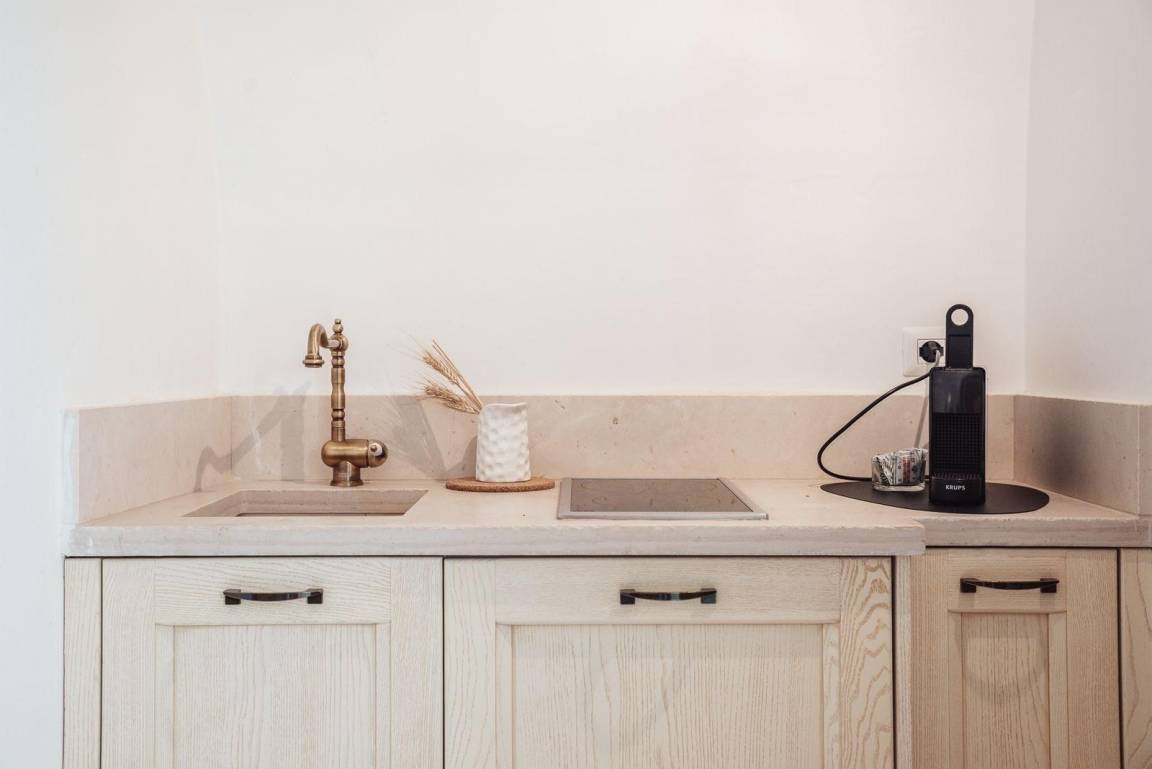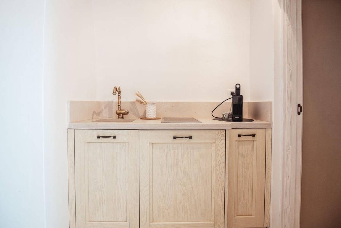Das Apartment ist ideal für bis zu zwei Gäste und verfügt über ein Doppelbett mit begehbarem Kleiderschrank, ein eigenes Badezimmer sowie eine Küche mit zwei Induktionskochfeldern und einem Minikühlschrank.