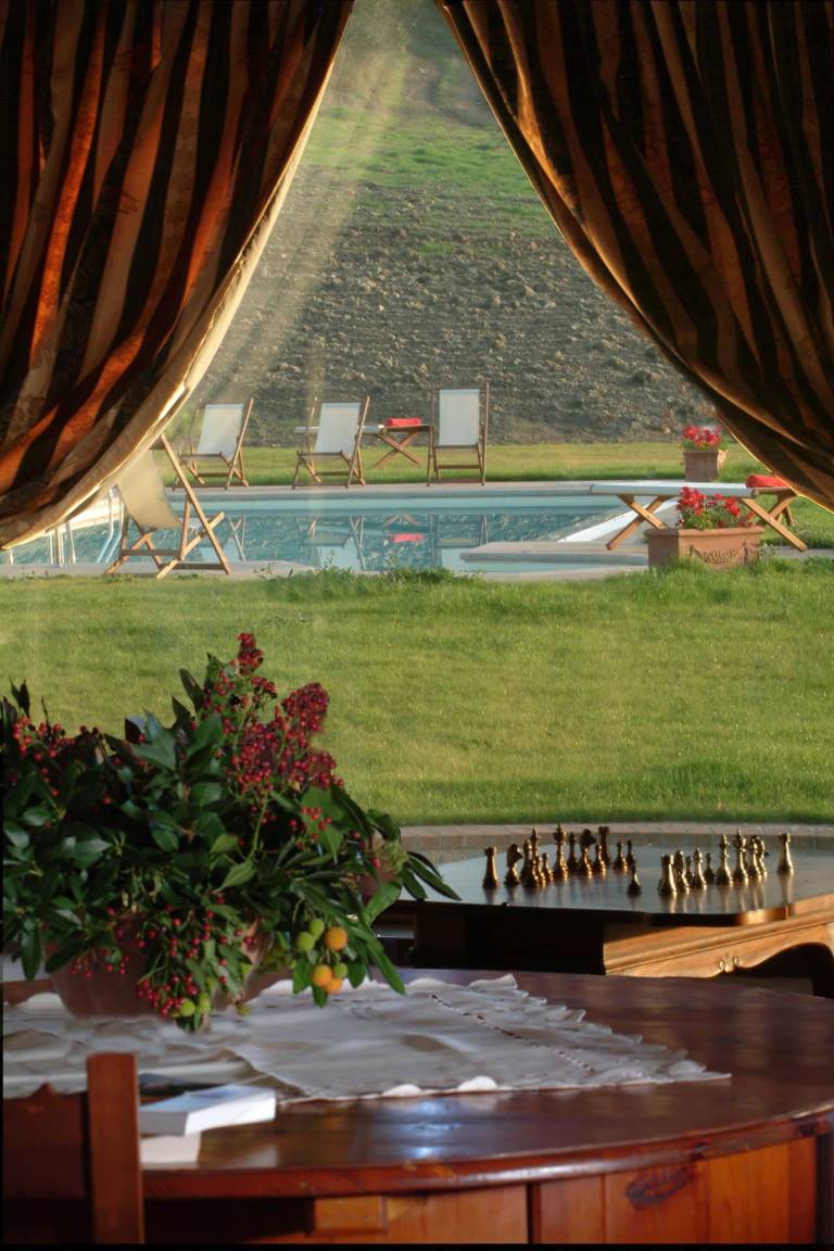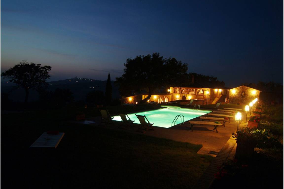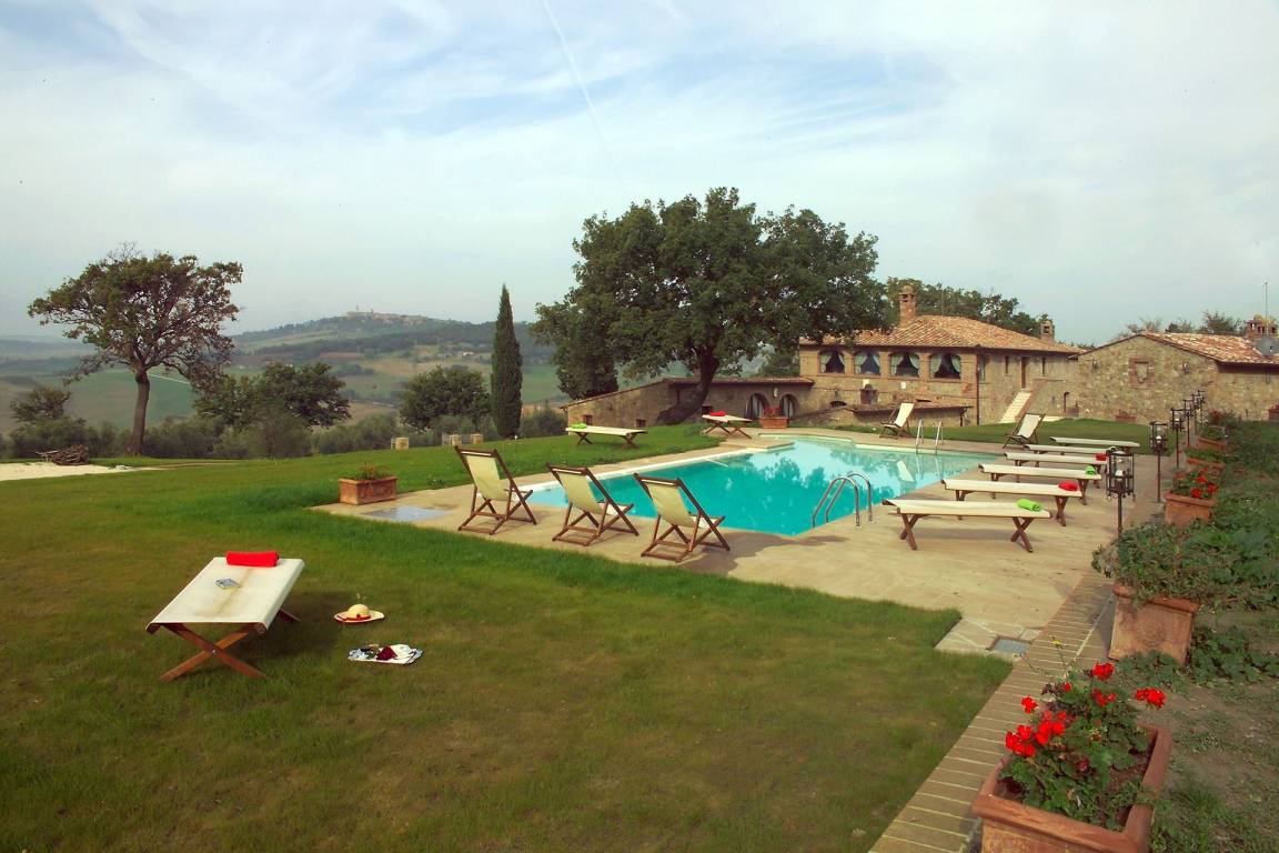 Die Villa liegt im Herzen des Orcia-Tals, umgeben von Weinbergen und charakteristischer toskanischer Landschaft. Das Dorf Monticchiello mit grundlegenden Dienstleistungen wie Lebensmittelladen und Restaurant liegt 2 km entfernt. Die nächstgrößere Stadt ist Pienza in 5 km Entfernung, gefolgt von Chianciano Terme mit Bahnhof in 10 km, Montepulciano in 13 km, Cortona in 25 km, Montalcino in 34 km, Siena in 54 km, Arezzo in 56 km, Perugia in 65 km, Flughafen Florenz in 110 km und Flughafen Rom in 175 km.