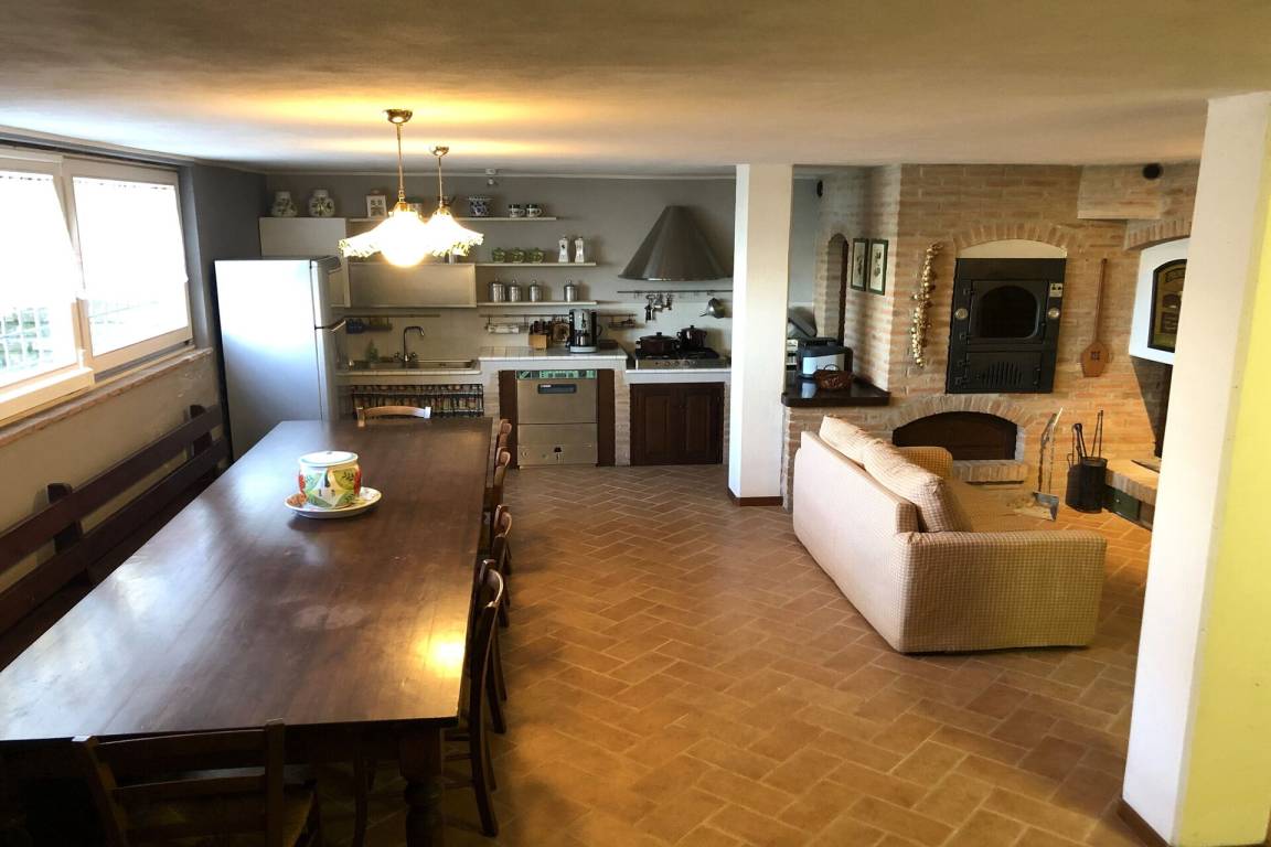Wohnküche: Esstisch (Personen: 10), Spülmaschine, Kühlschrank, Tiefkühler, Herd, Ofen, Toaster, Italienische Kaffeemaschine, Sofa, TV.