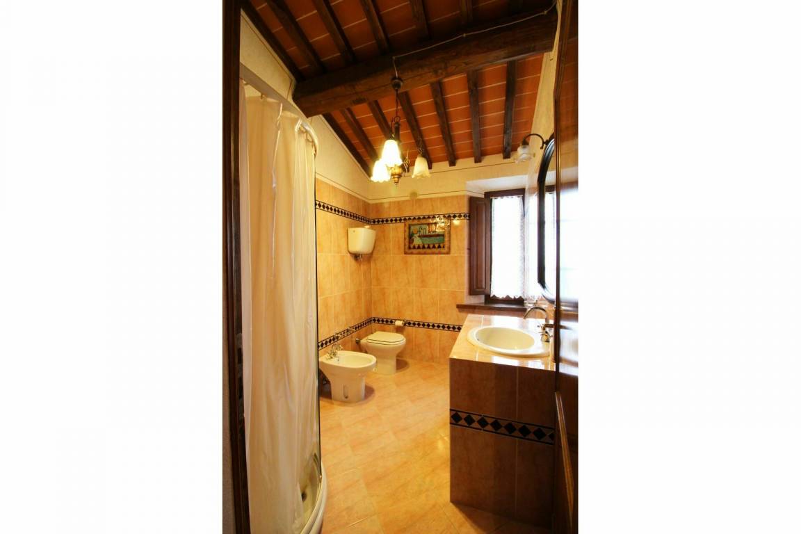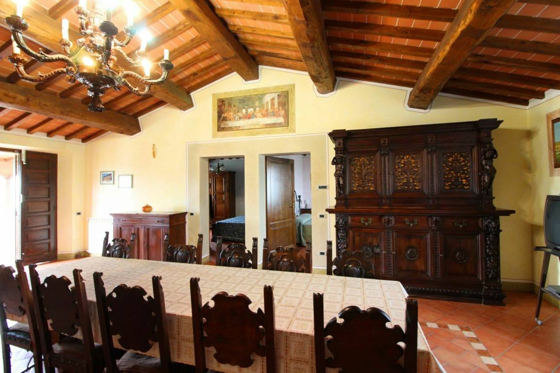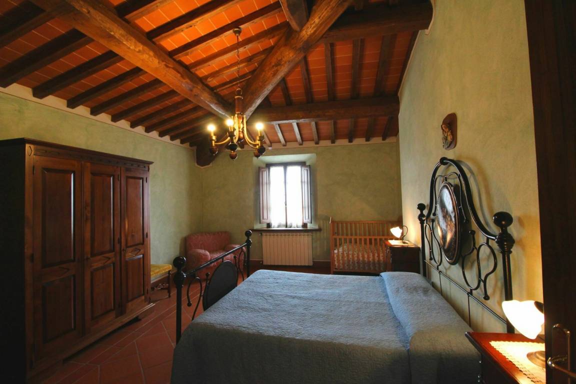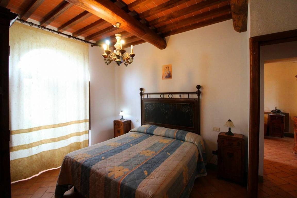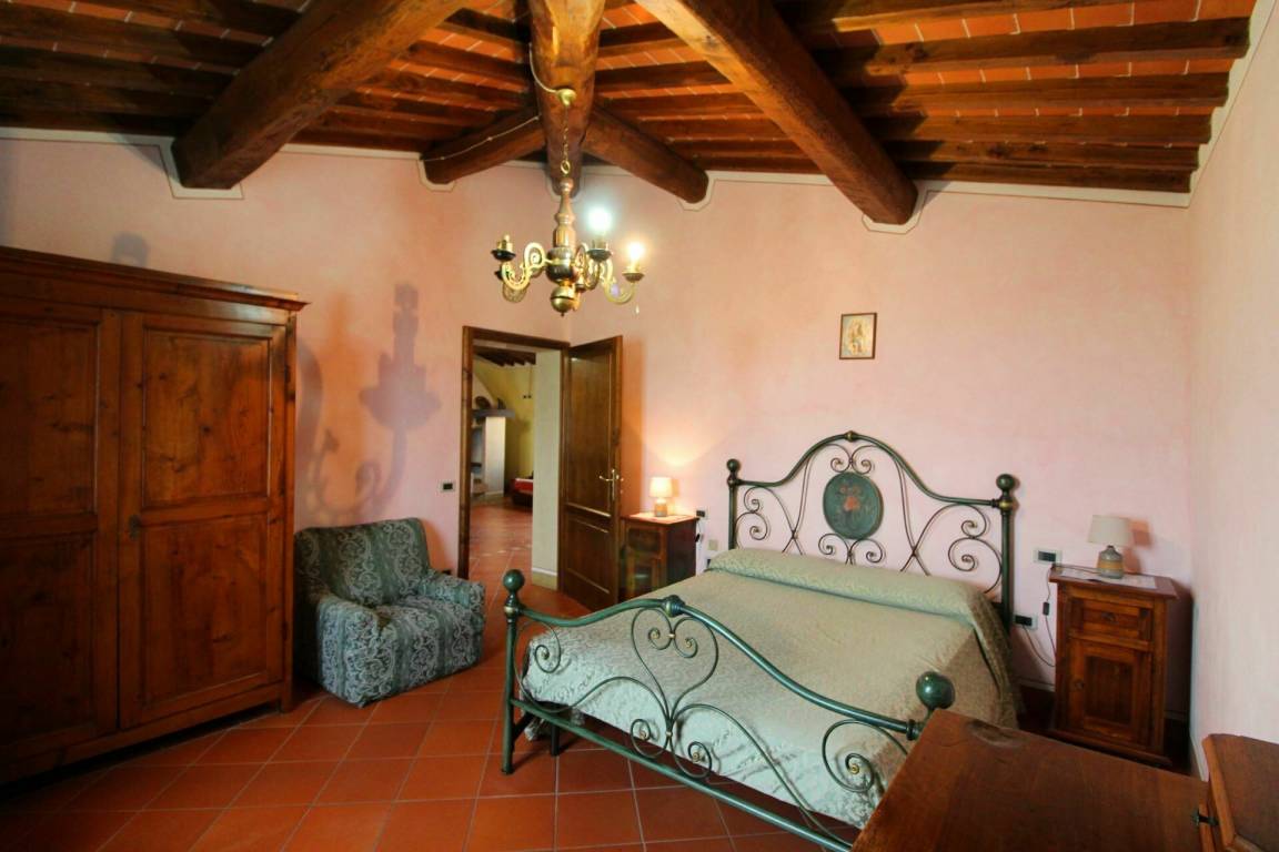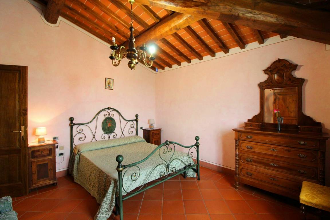 ERSTER STOCK: Eingang über eine Naturstein Außentreppe mit kleiner Panoramaloggia. Geräumige Wohnzimmer, großem Kamin und Sofa, 4 Doppelzimmer, Schlafzimmer mit französischem Bett (m. 1,40), zwei Badezimmer mit Dusche.