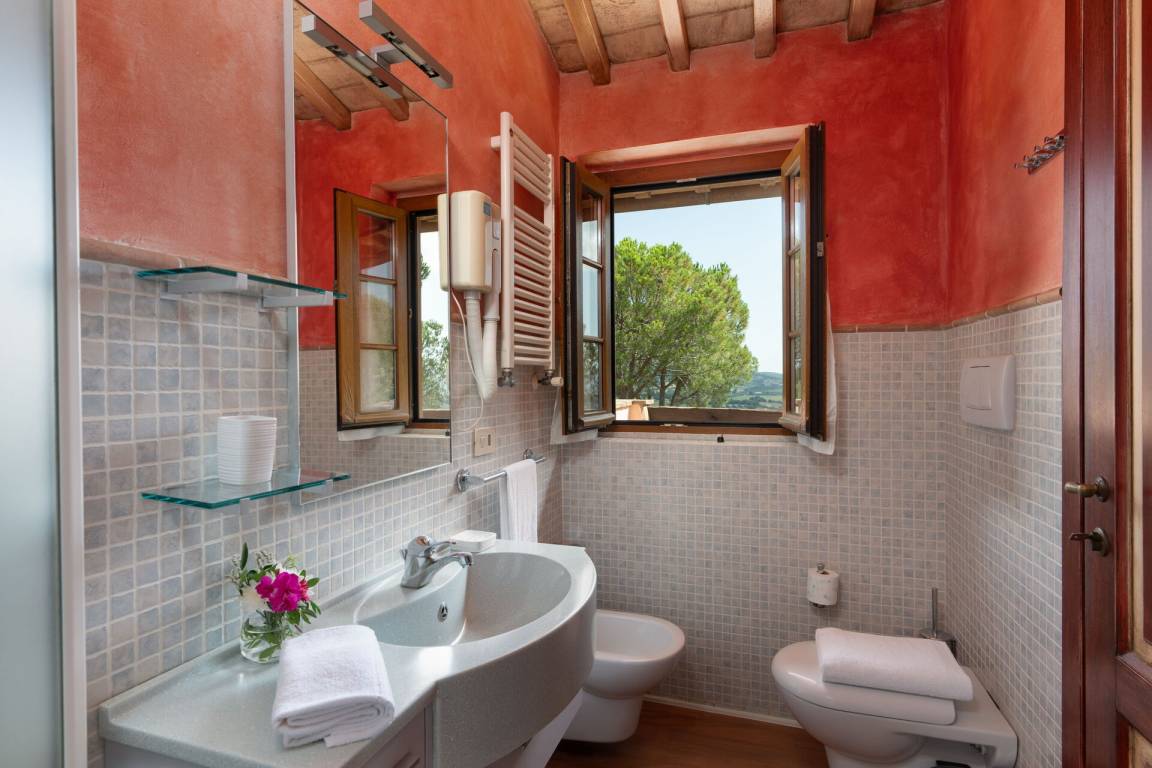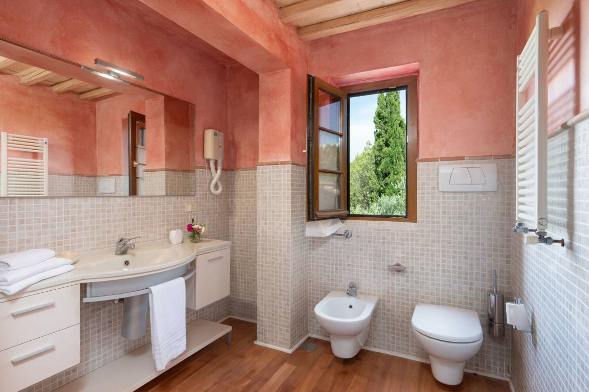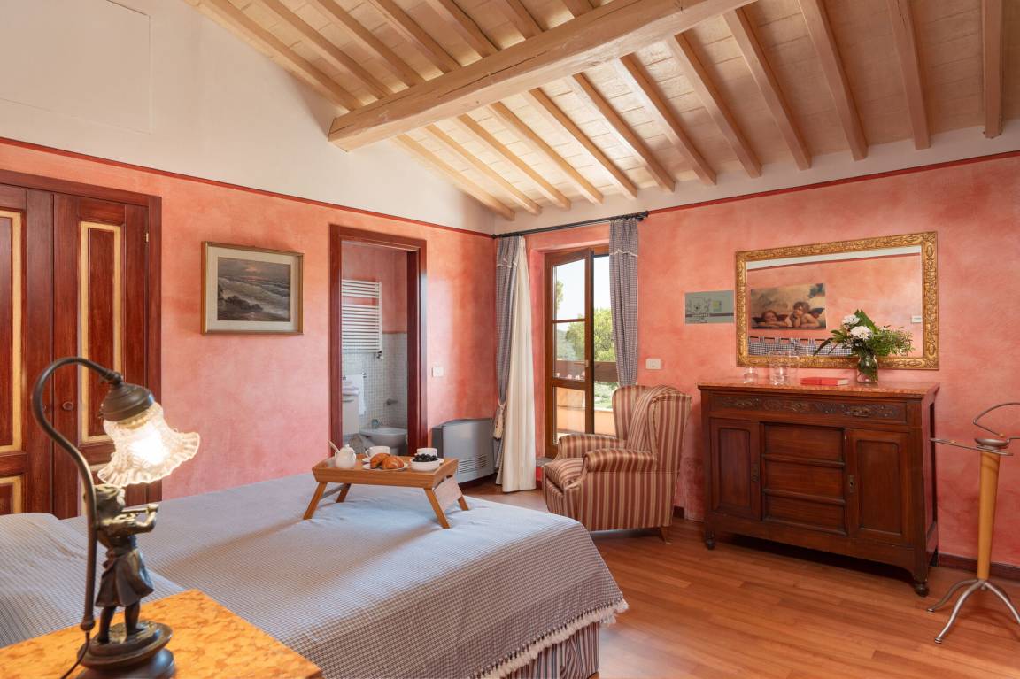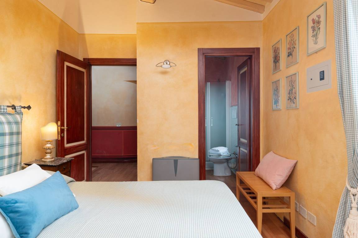 Schlafzimmer mit Bad 6 (14.85 m²): Doppelbett, WiFi Internet, Klimaanlage, Safe, Waschbecken, WC, Bidet, Dusche.