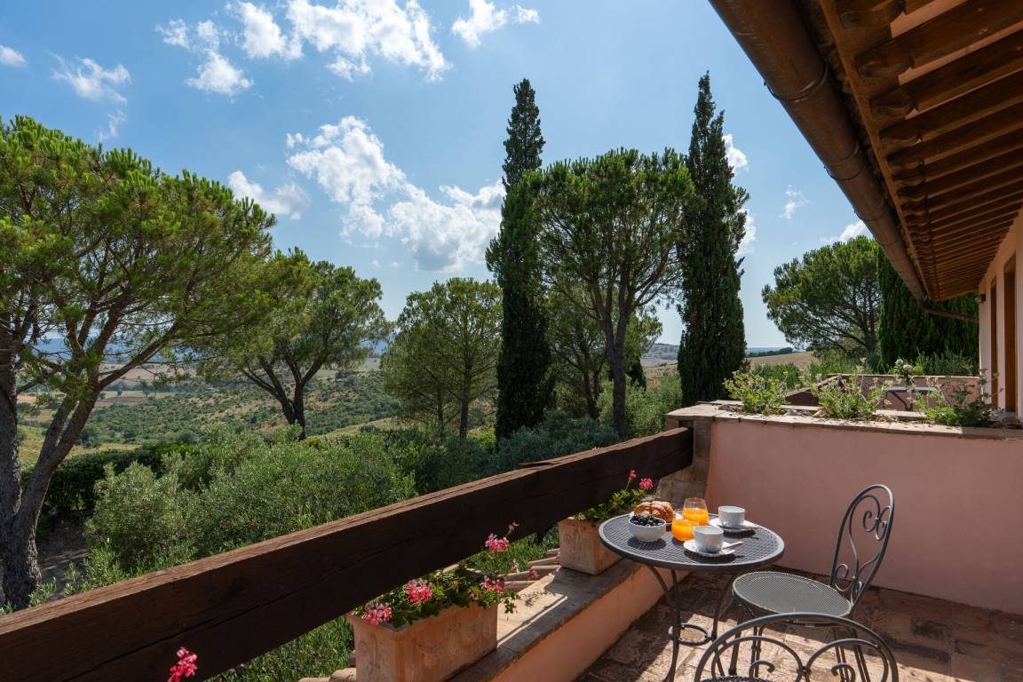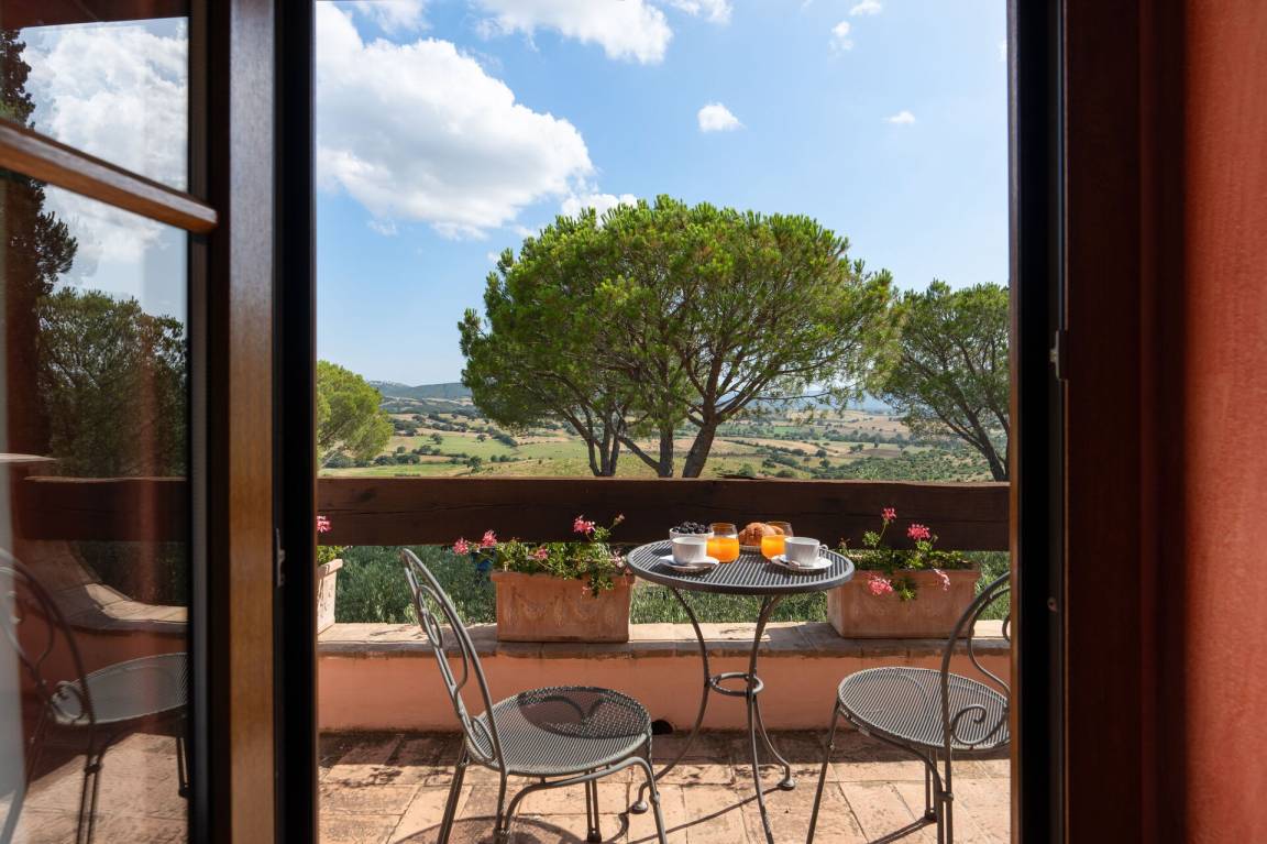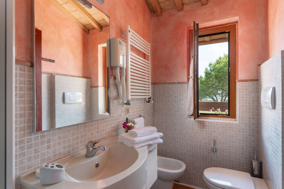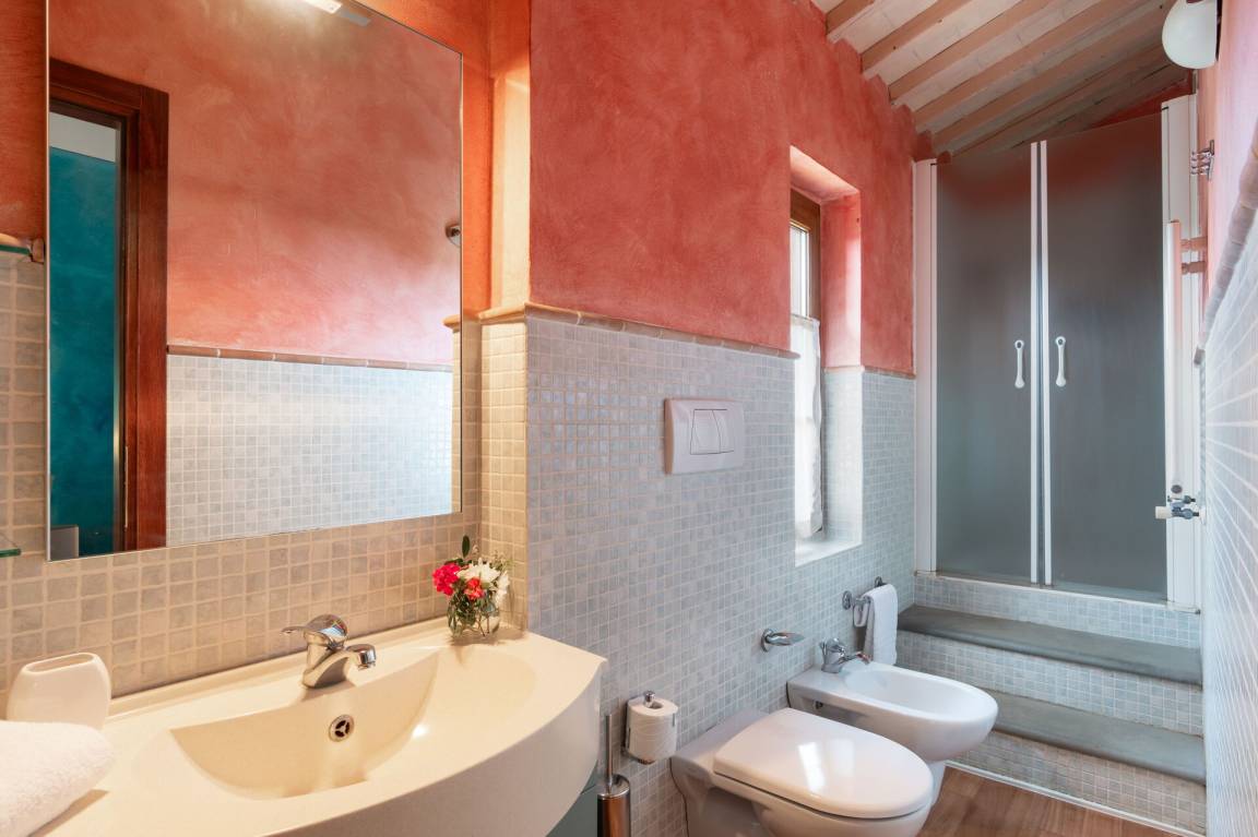 Schlafzimmer mit Bad 4 (17.5 m²): Doppelbett, WiFi Internet, Klimaanlage, Safe, Waschbecken, WC, Bidet, Dusche, Ausgang auf die Terrasse.