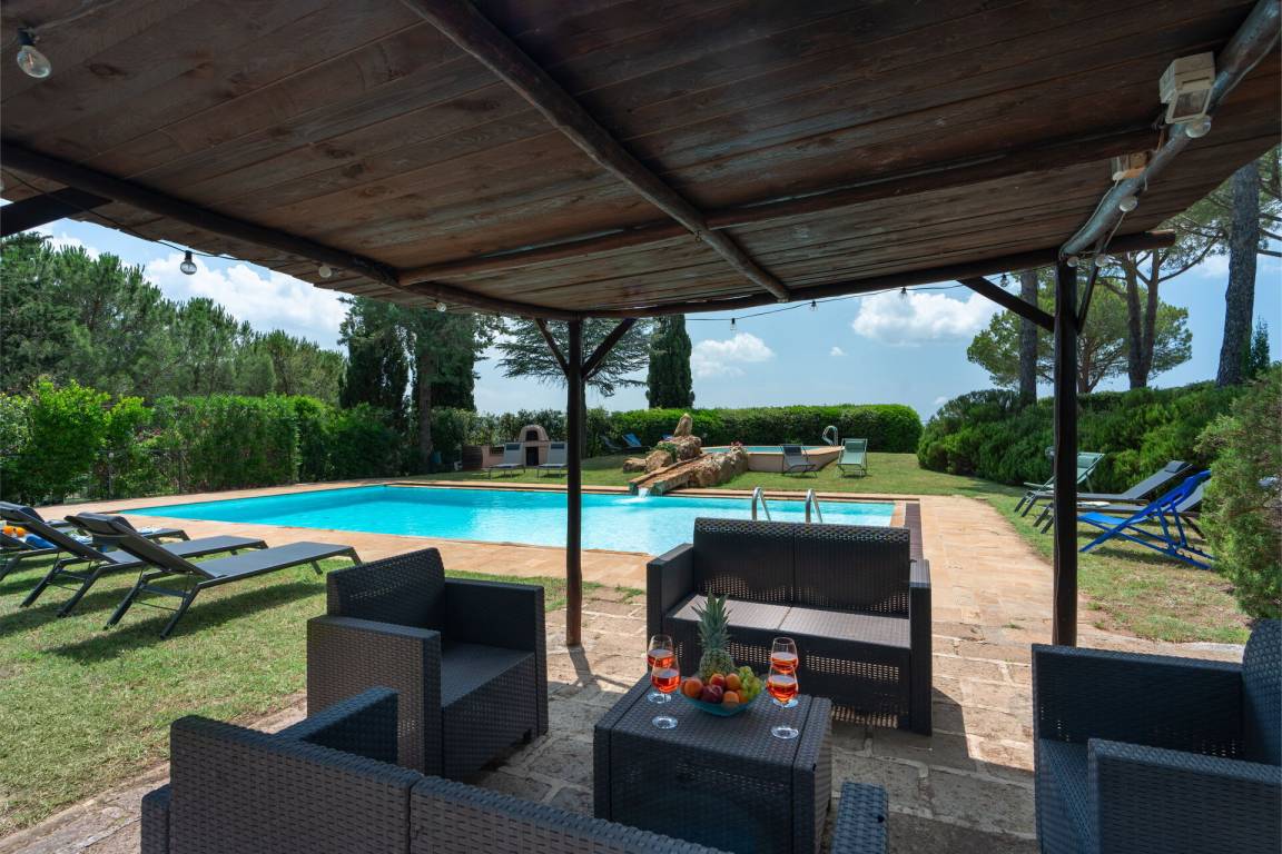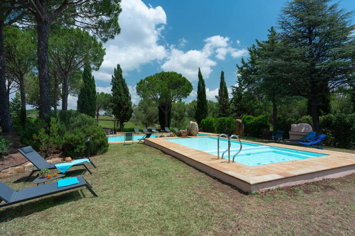 Garten (4500 m²): Schwimmbad (privat, Breite: 6m, Länge: 12m, max. Tiefe: 2.6m, min. Tiefe: 1.2m, Außen), Schwimmbad (privat, Breite: 3.75m, Länge: 4.9m, Tiefe: 0.7m, Außen), Heißwasser-Whirlpool im Freien (Breite: 3.75m, Länge: 2.8m), Dusche, Grill, Außenbereich für das Essen im Freien, Esstisch (Personen: 14), Gartenmöbel, Terrassenmöbel, sechs Sonnenliegen, eingezäunt.