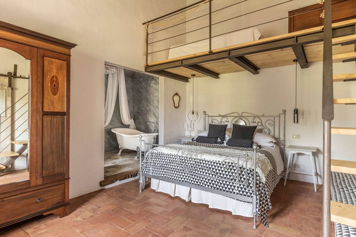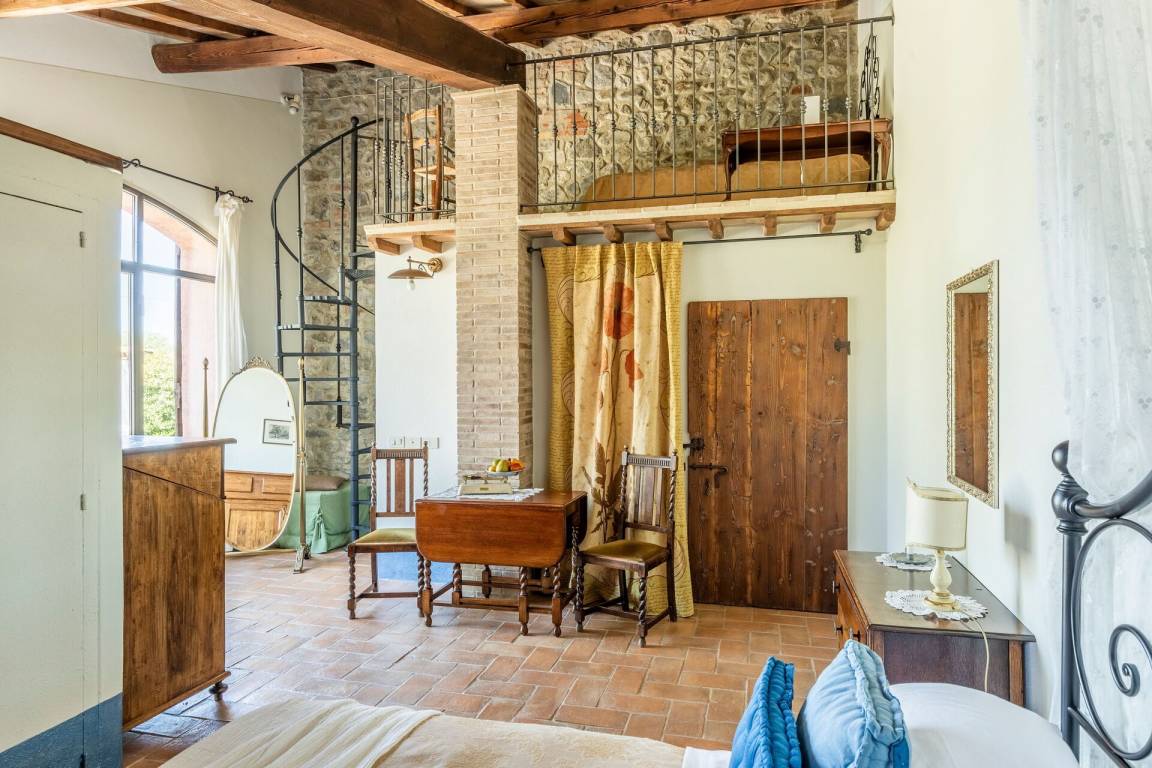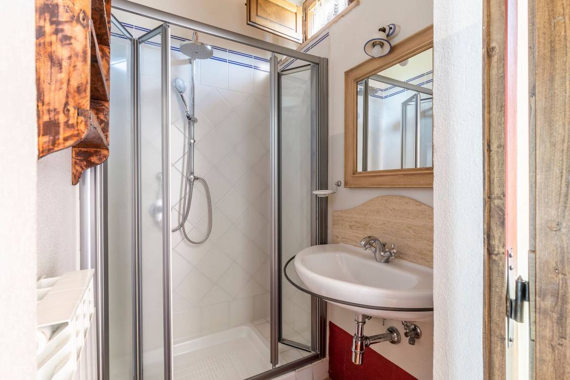 Erdgeschoss: Wohnzimmer mit Kamin, 2 Doppelzimmer, beide mit privatem Bad mit Dusche und direktem Zugang nach draußen, Zimmer mit Doppelbett und 1 Einzelbett (im Dachgeschoss) mit privatem Bad mit Dusche und direktem Zugang nach draußen, Doppelzimmer mit privatem Bad mit Dusche und Dachgeschoss mit 2 Einzelbetten, Wohnzimmer mit Kamin, Hauptwohnzimmer mit Essbereich, Kamin, Tischen, Sofas und Küche (Backofen, Mikrowelle, Geschirrspüler, 2 Kühlschränke mit Gefrierfach, Toaster, Zitruspresse, Mixer, Blender, Mokkakanne, amerikanische Kaffeemaschine, Espressomaschine „Lavazza" mit Kapseln), WC.