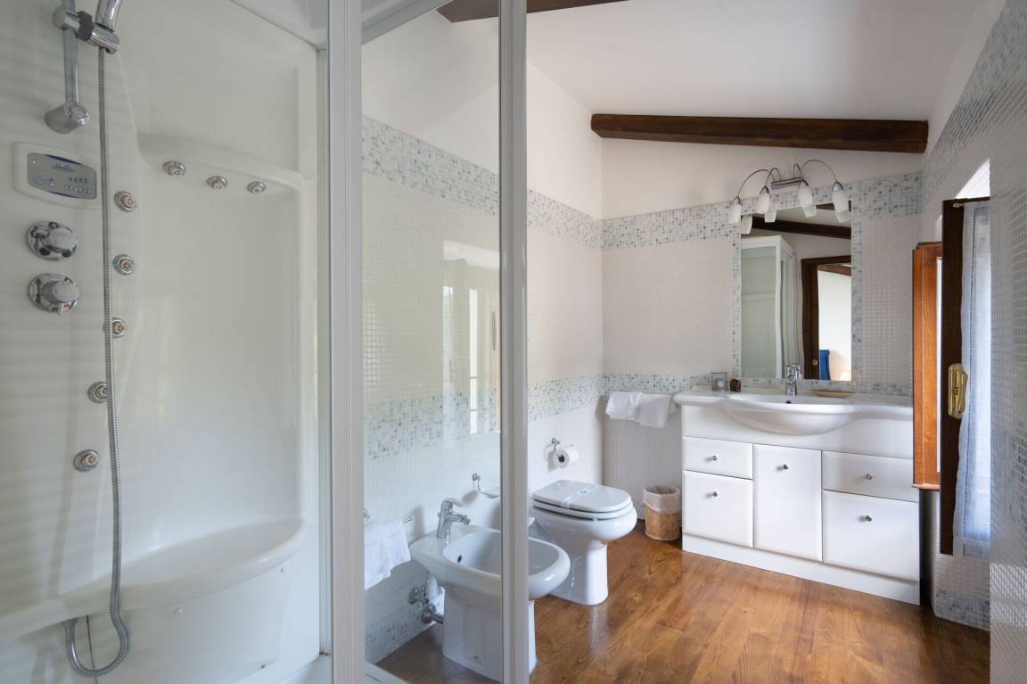 Schlafzimmer mit Bad 2: Doppelbett, WiFi Internet, Klimaanlage, Waschbecken, WC, Bidet, Dusche.