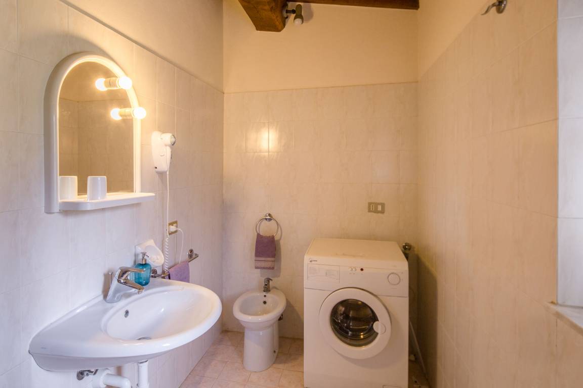 Badezimmer 1 (4 m²): Waschbecken, WC, Bidet, Dusche, Bügeleisen, Fön, Waschmaschine, WiFi Internet, Ohne Fenster.