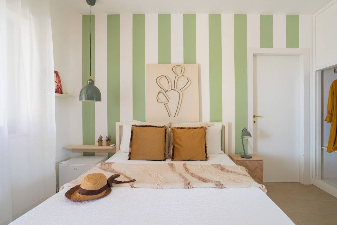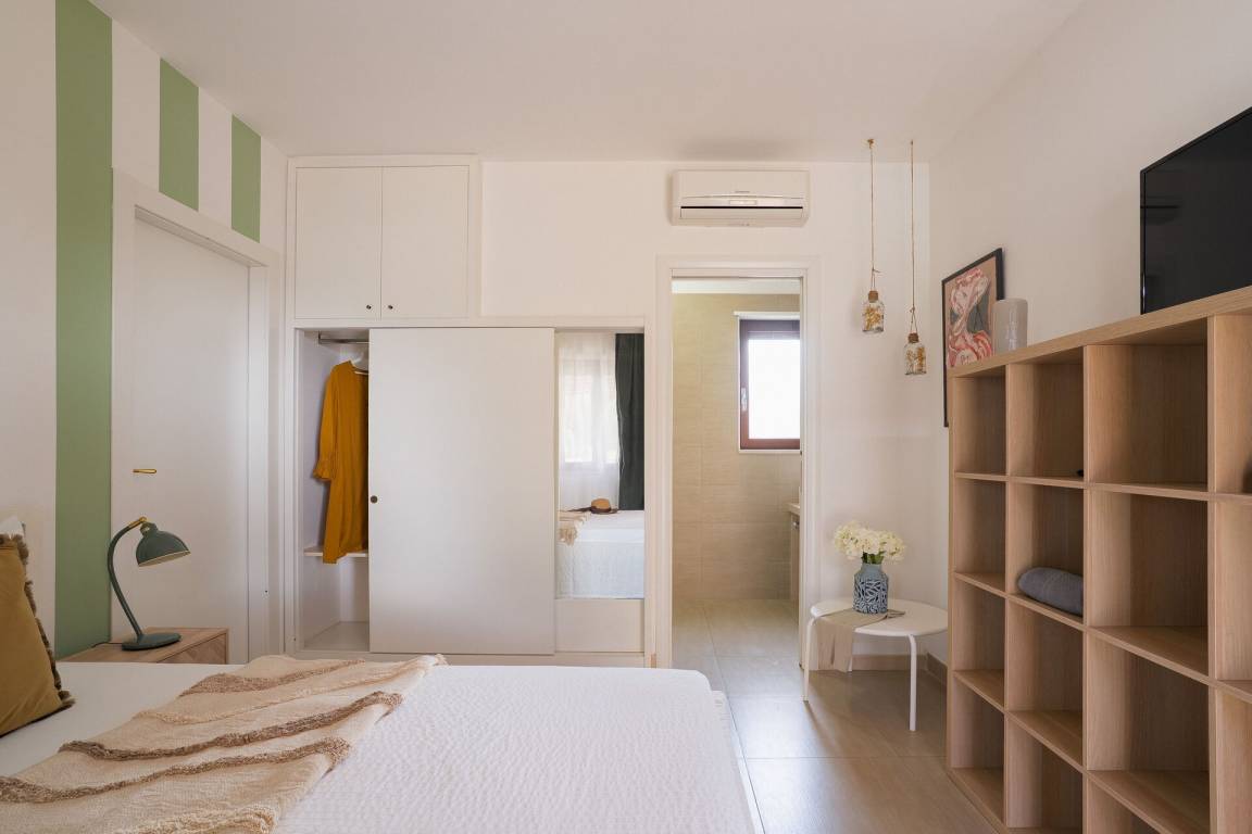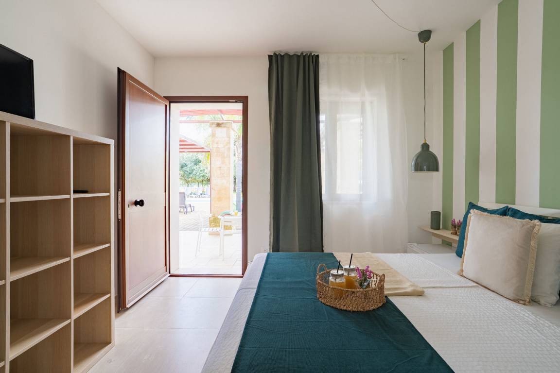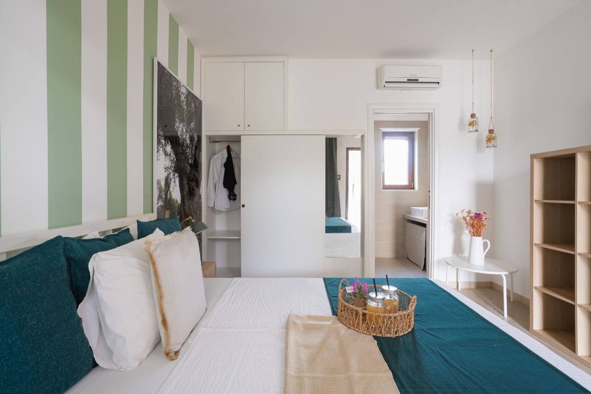 Schlafzimmer mit Bad 1: Doppelbett, Klimaanlage, TV, Waschbecken, WC, Dusche, Fön, Ausgang auf den Patio.