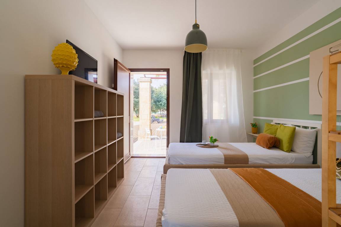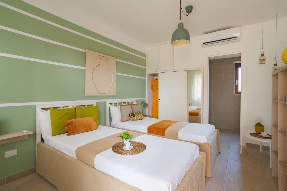 Schlafzimmer mit Bad 4: zwei Einzelbetten, Klimaanlage, TV, Waschbecken, WC, Dusche, Fön, Ausgang auf den Patio.