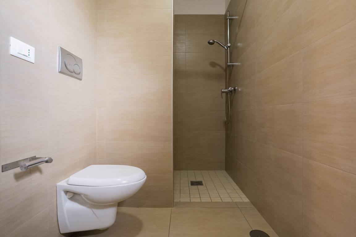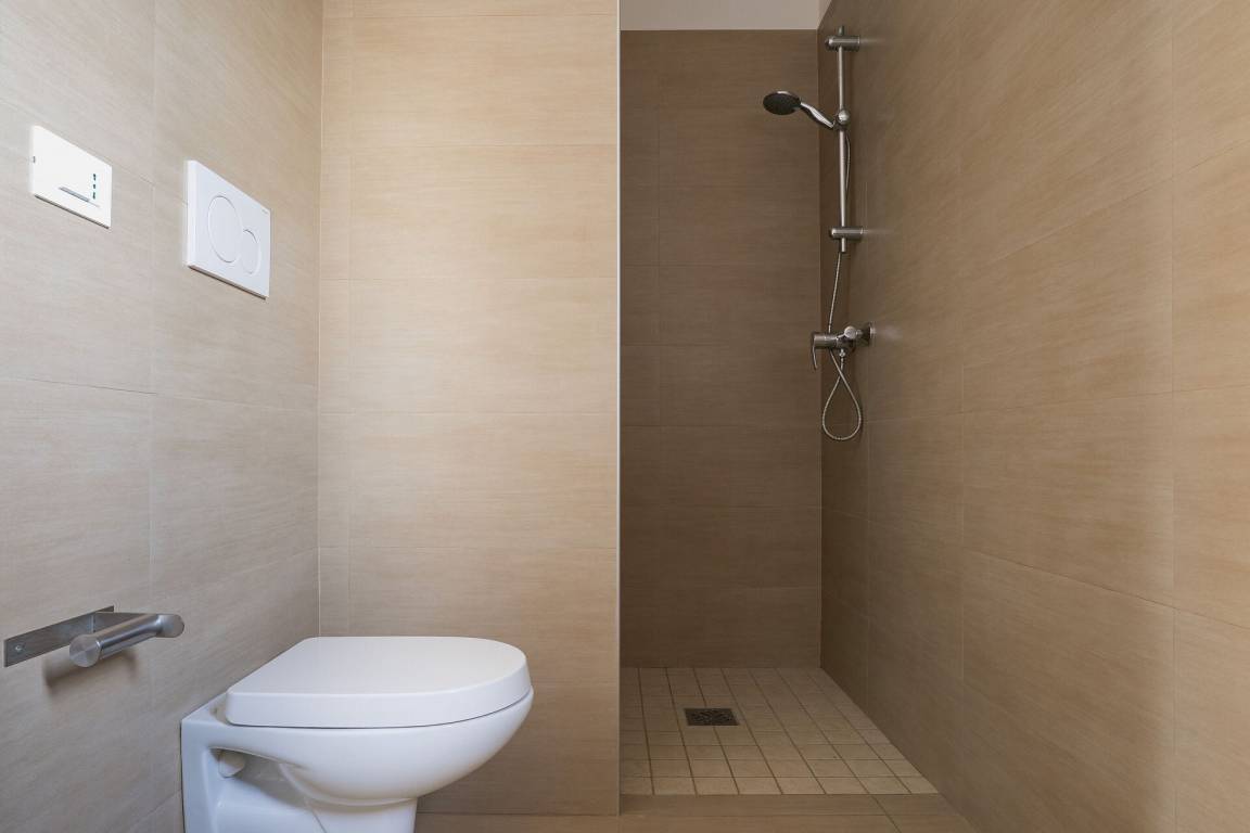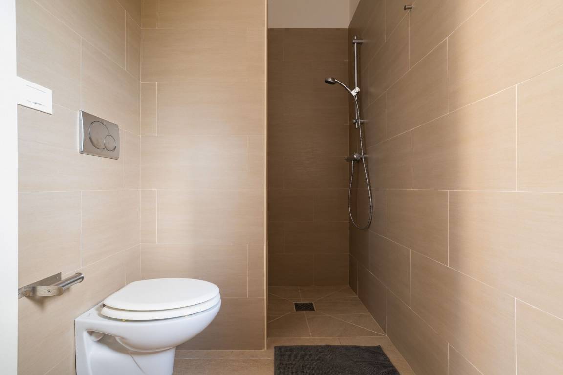 Badezimmer: Waschbecken, WC, Dusche, Fön.