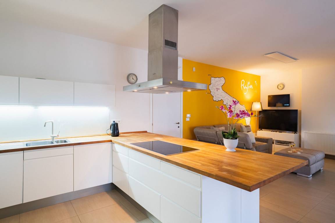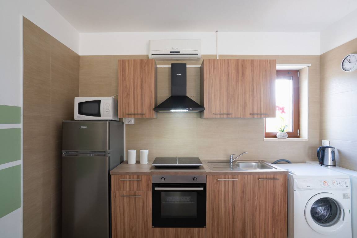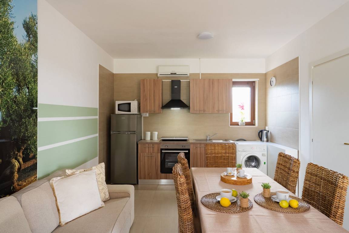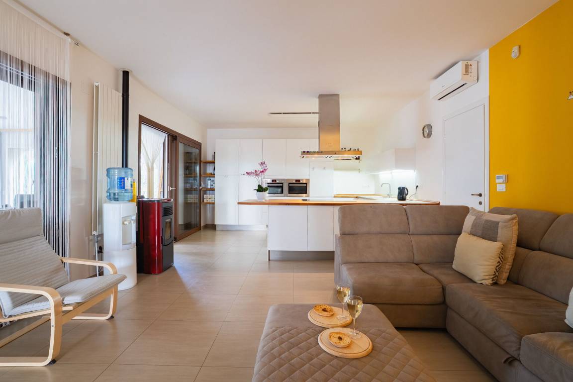 Wohnküche: gut ausgestattete Küche, Esstisch, Spülmaschine, Kühlschrank, Tiefkühler, Mikrowelle, Herd, Ofen, Italienische Kaffeemaschine, Sofa bed, Internet, Klimaanlage, TV, Ausgang auf den Garten, Ausgang auf den Patio.