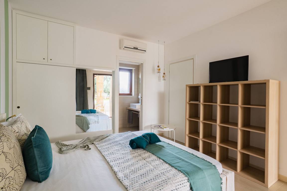 Schlafzimmer mit Bad 2: Doppelbett, Klimaanlage, TV, Waschbecken, WC, Dusche, Fön, Ausgang auf den Patio.