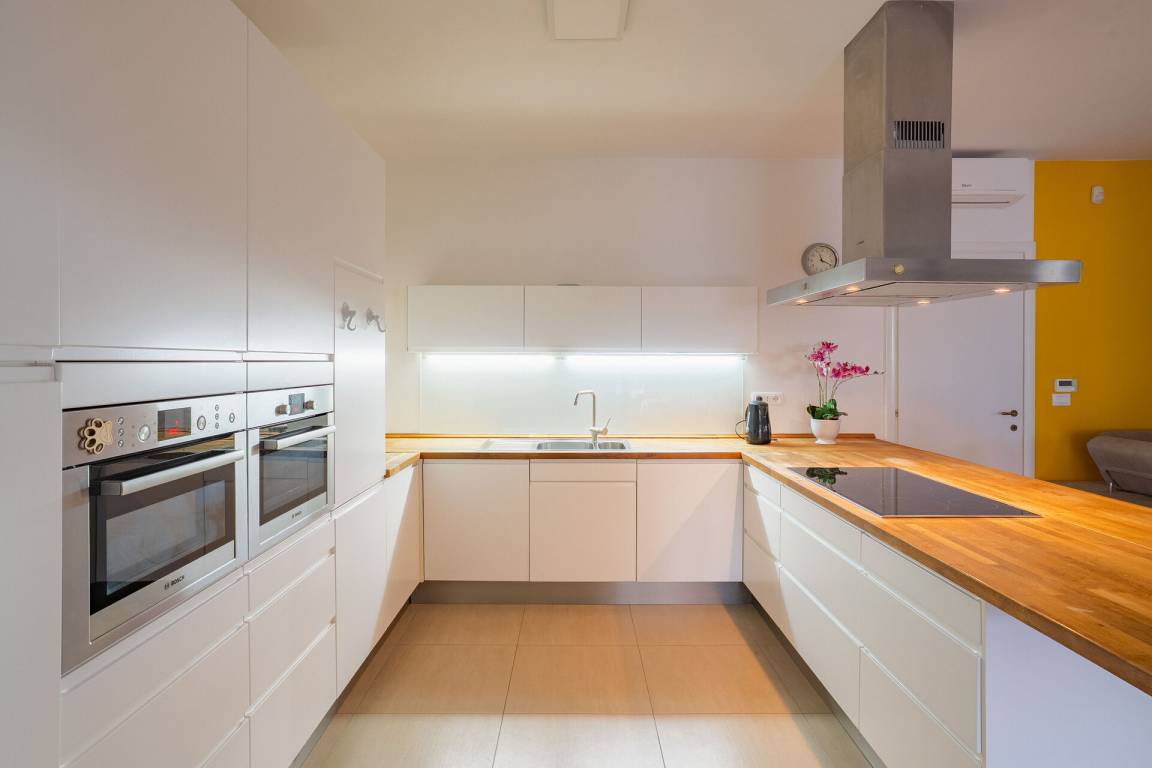Küche: gut ausgestattete Küche, Esstisch, Mikrowelle, Herd, Italienische Kaffeemaschine, Waschmaschine, Klimaanlage, Ausgang auf den Patio.