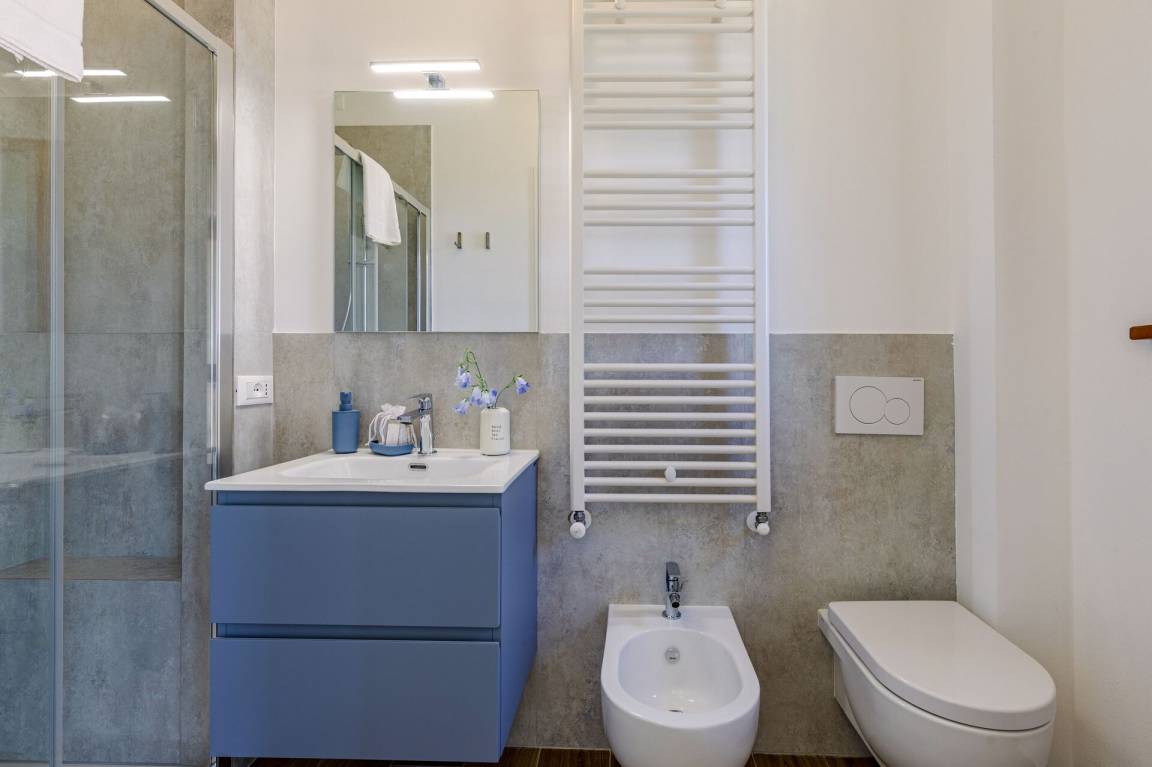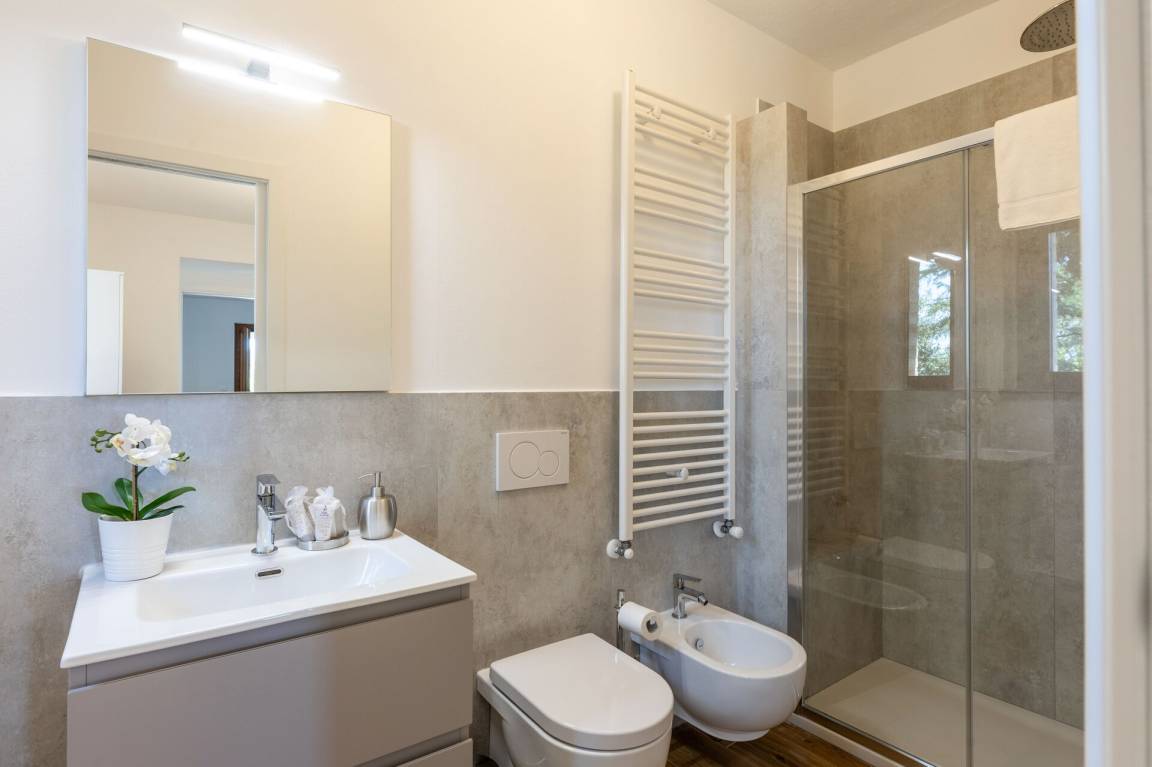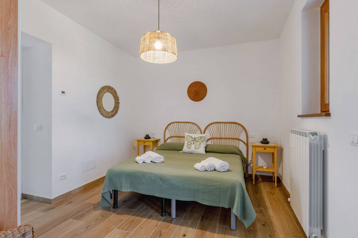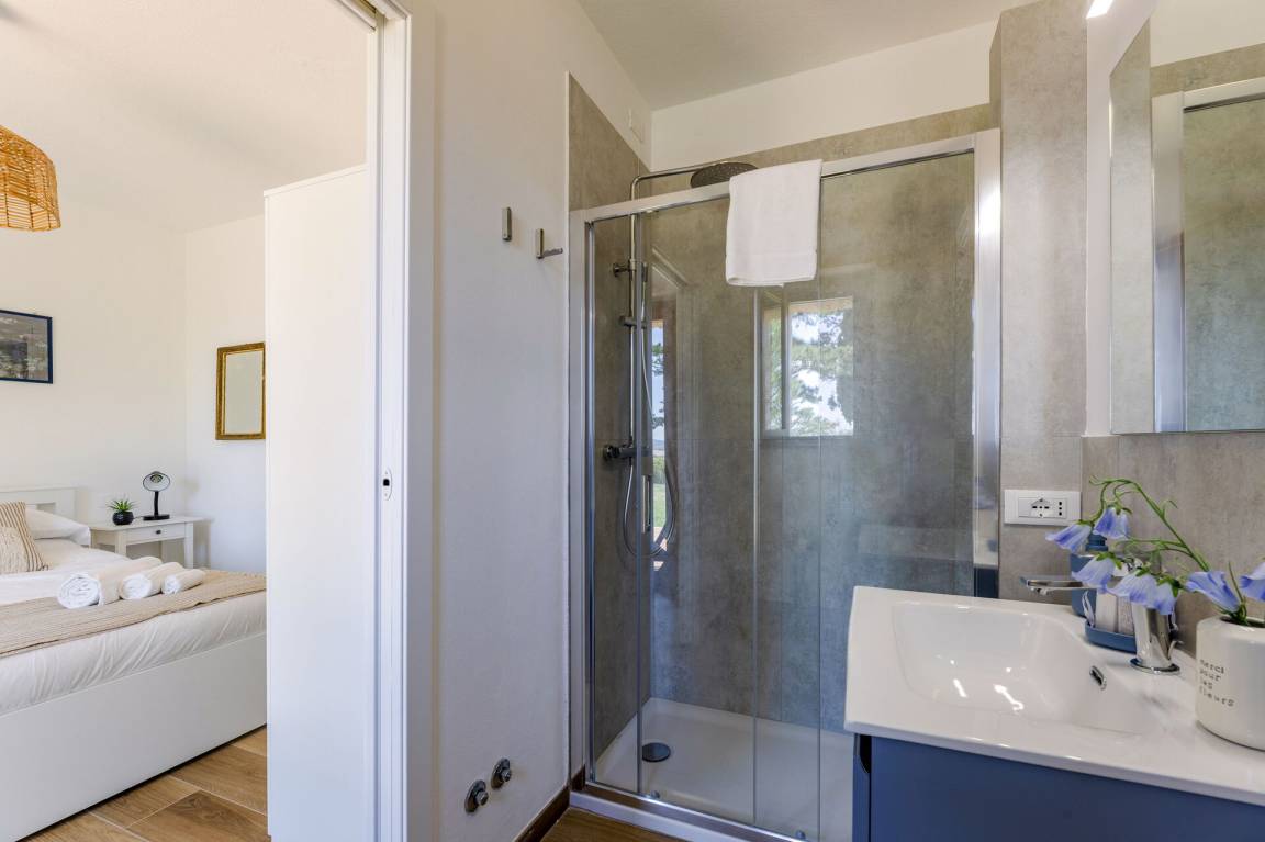 Schlafzimmer mit Bad 4: Doppelbett, WiFi Internet, Waschbecken, WC, Bidet, Dusche.