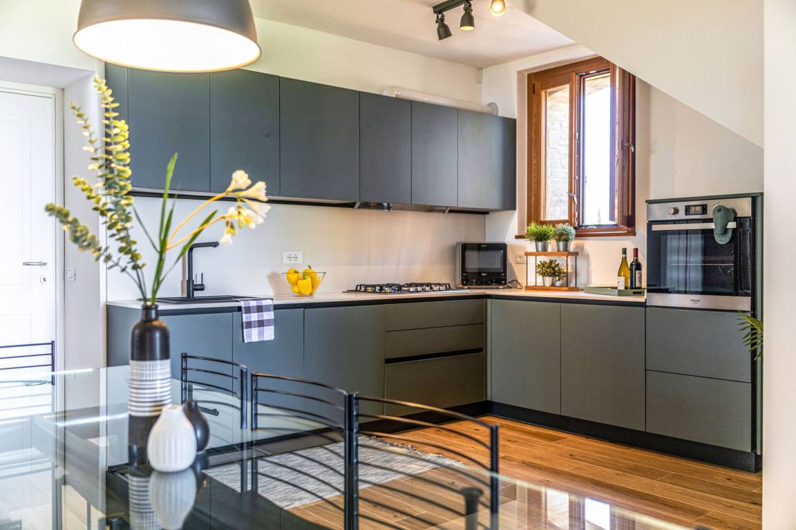 Wohnküche: gut ausgestattete Küche, Esstisch, Tiefkühler, Herd, Ofen, Doppel-Schlafsofa, WiFi Internet, Satelliten-TV, Ausgang auf den Garten, Ausgang auf den Patio.