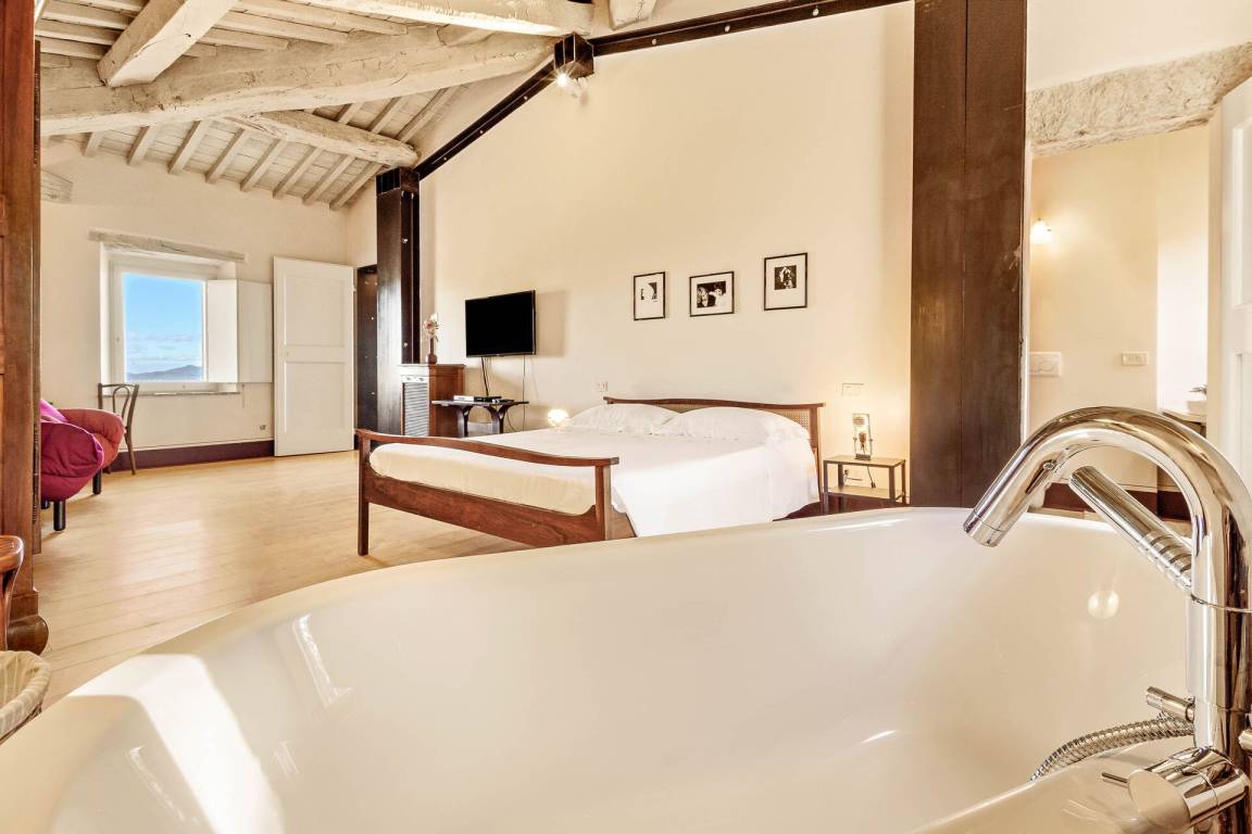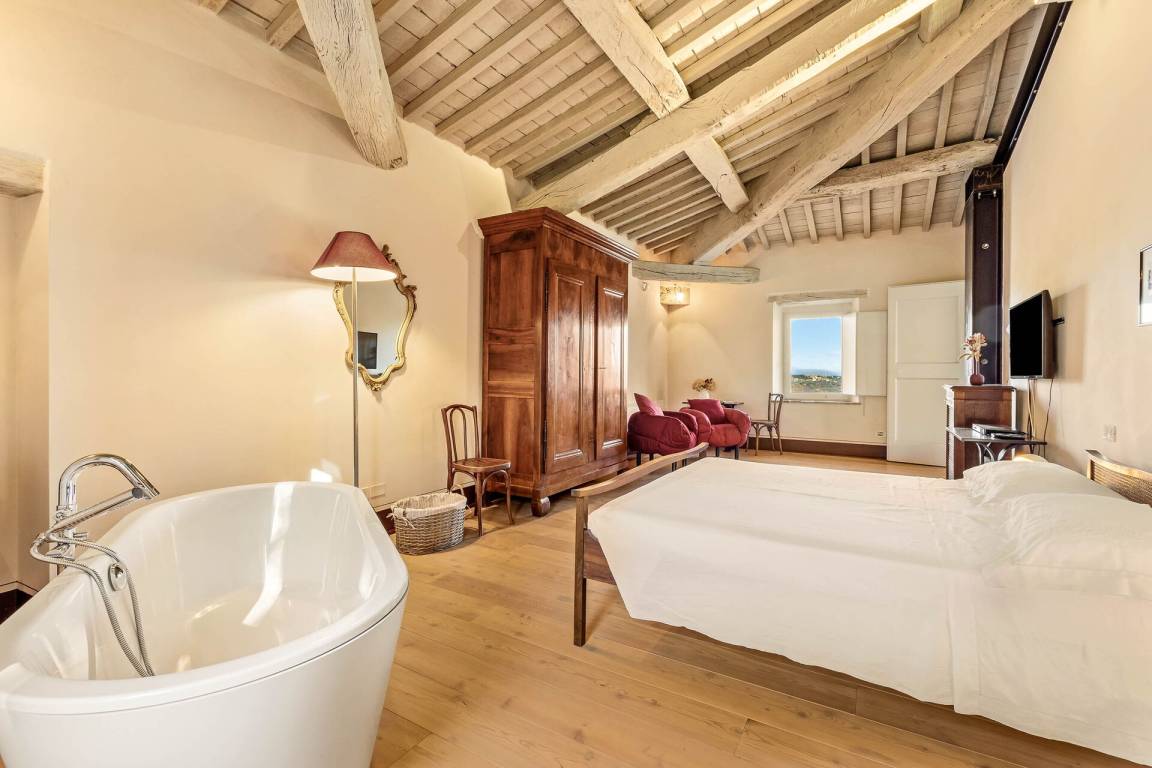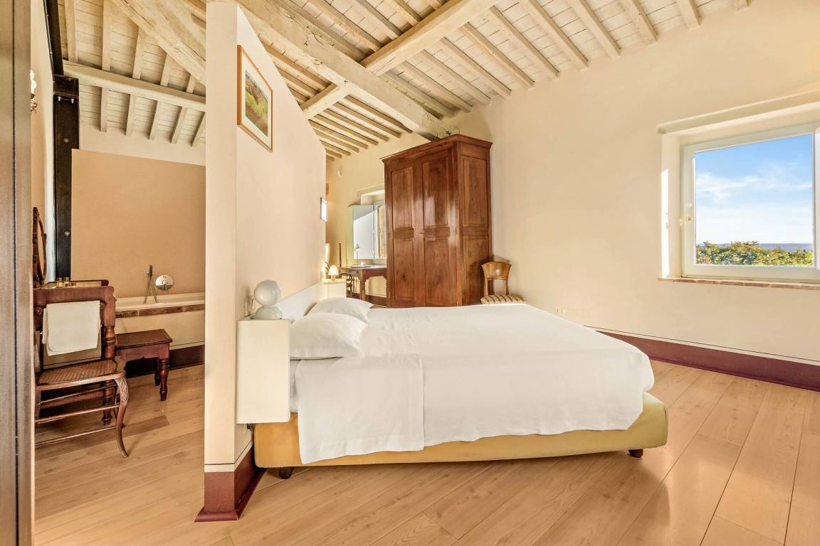 Schlafzimmer mit Bad 2: Doppelbett, WiFi Internet, Klimaanlage, Fliegengitter, Sessel, Waschbecken, WC, Bidet, Badewanne, Dusche.