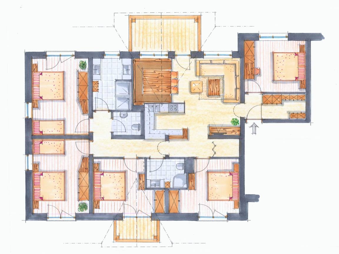 Layout : In der 2. Etage(privater Eingang): offene Küche mit Kochplatte(4 Kochplatten, Induktion), Wasserkocher, Toaster, Kaffeemaschine(Filter), Backofen, Mikrowelle, Geschirrspüler, Kühlschrank , Wohn/Esszimmer mit 2x TV, Esstisch(12 Personen), Sitzecke , 3x Schlafzimmer mit Doppelbett(180 x 200 cm), TV , 2x Schlafzimmer mit Einzelbett(90 x 200 cm), Doppelbett(180 x 200 cm), TV , Badezimmer mit 2x Waschbecken, 2x Dusche , Badezimmer mit Waschbecken, Dusche , Toilette mit Waschbecken , 2x Balkon