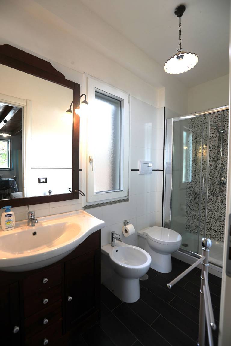 Piccola Dea includes a living area and a modern bathroom (shower/WC/bidet). The living area is a bright room with pull-down bed for two, sofa, dining furniture and kitchen unit (incl. gas stove, oven, refrigerator with freezer compartment).