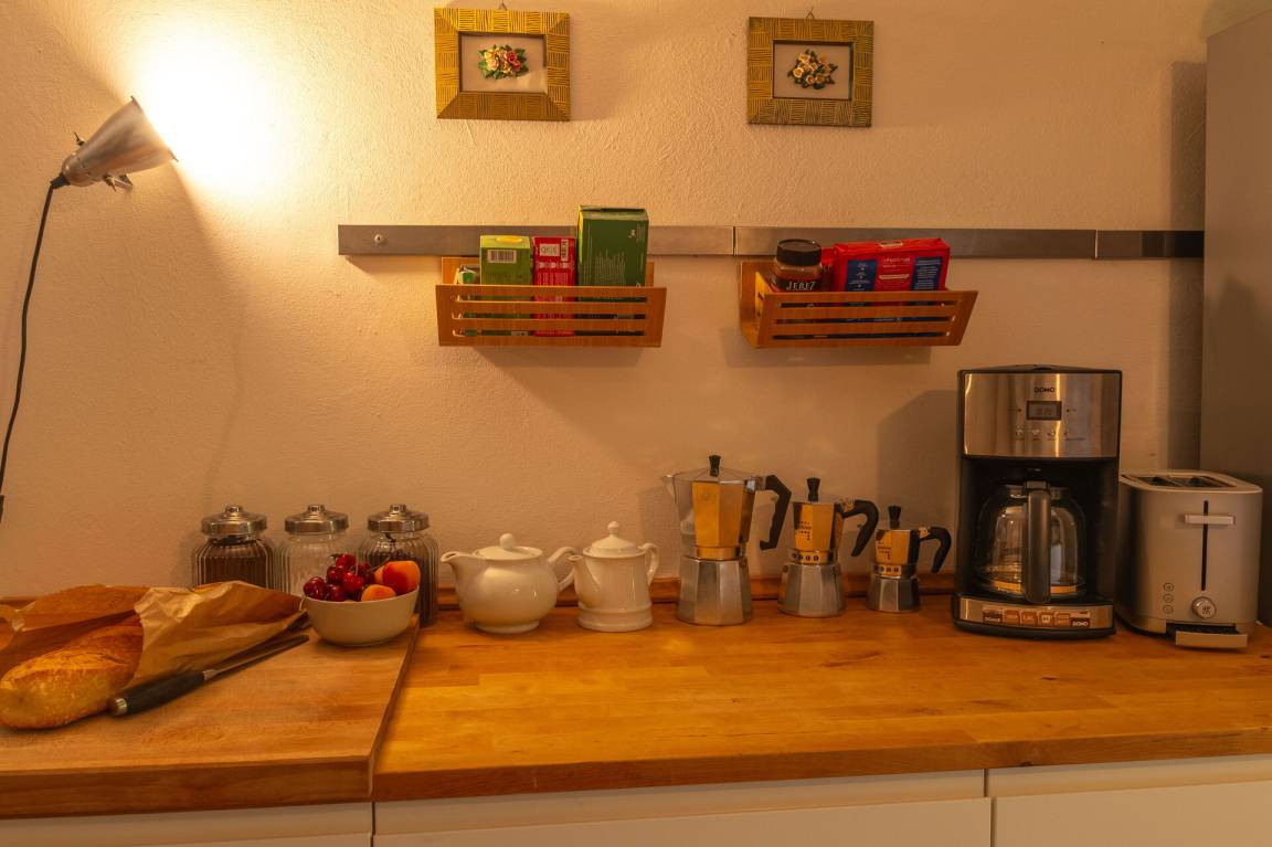 Große, voll ausgestattete Küche (Mikrowelle, Kühl-/Gefrierschrank, Herd, Backofen, Kaffee-/Teemaschine, Besteck, Küchenutensilien und Basics wie Öl, Essig, Salz, Zucker, Kaffee, Reinigungsmittel);