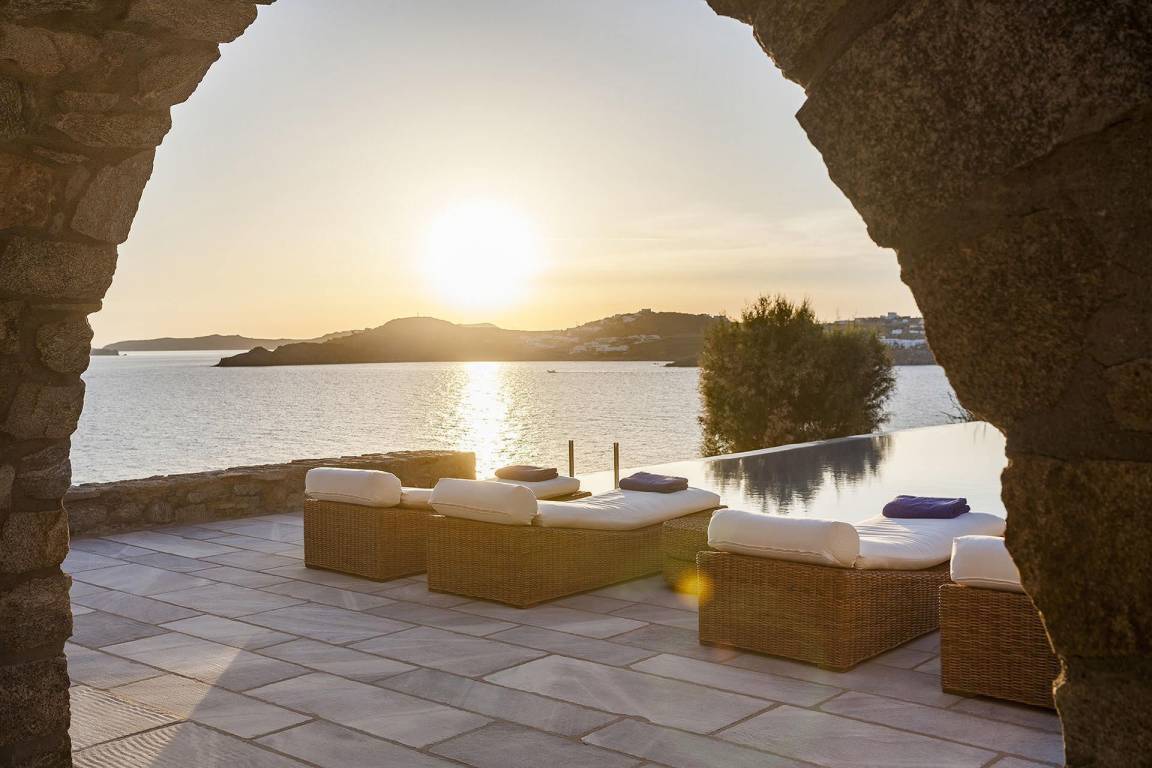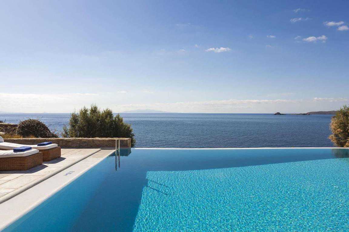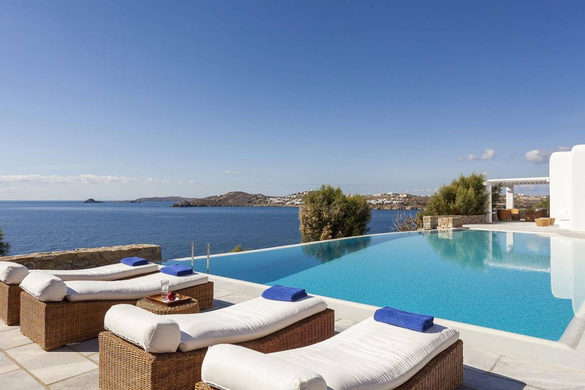 Die Villa Pinta liegt im Südwesten von Mykonos und bietet unverbaute Ausblicke auf die Inseln Delos und Rhenia sowie die umliegende Ägäis.