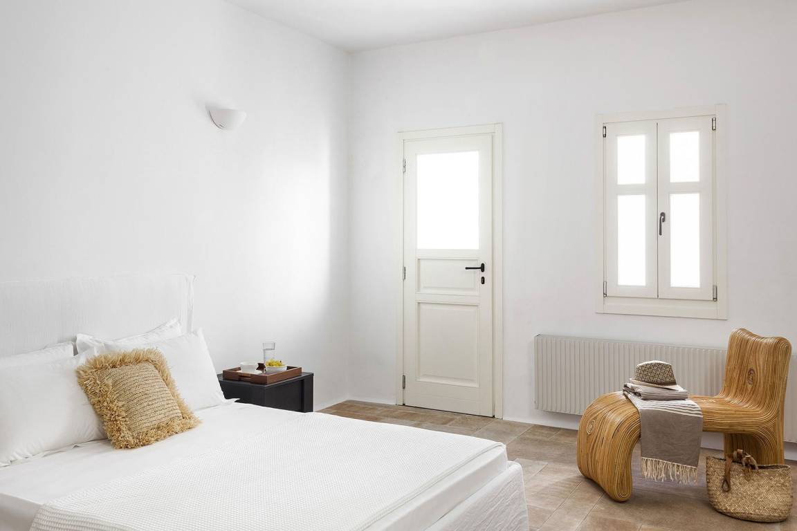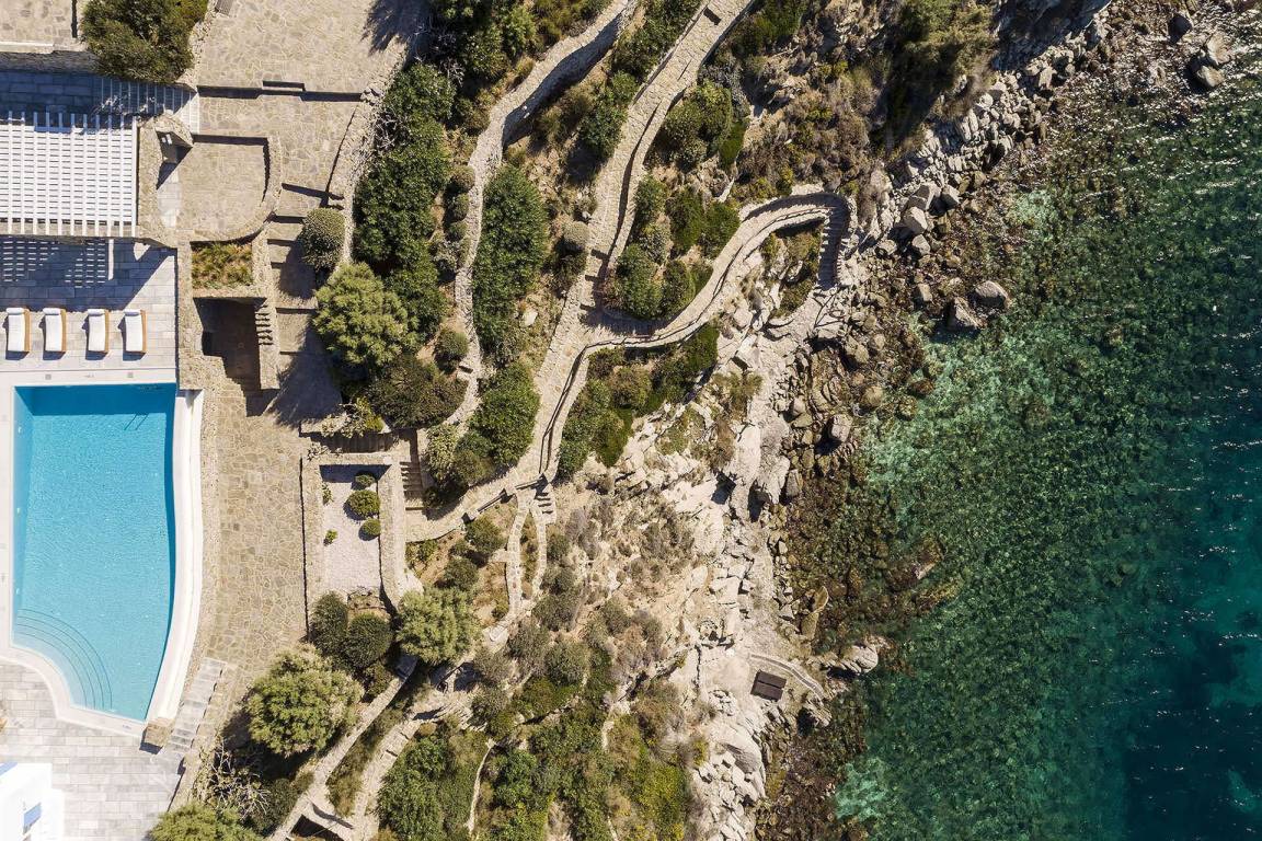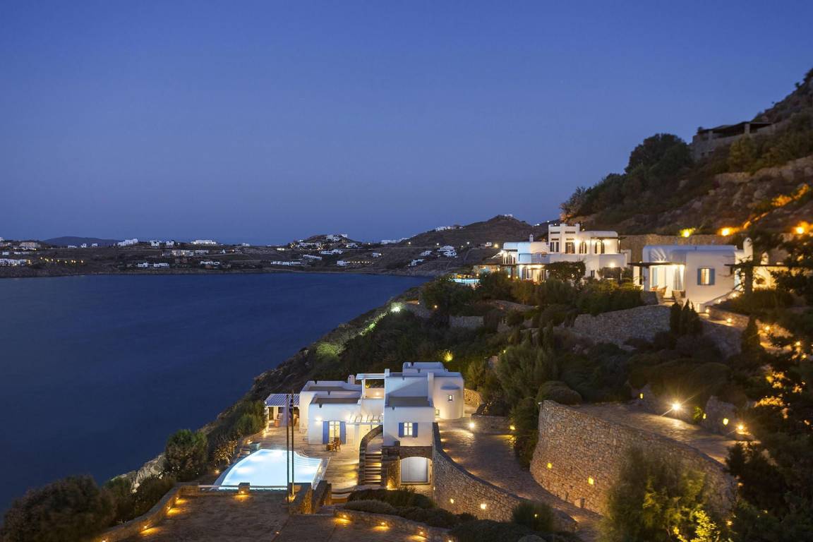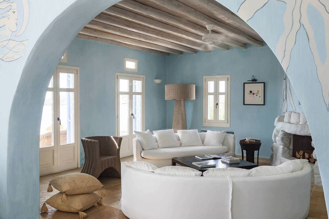 Die Villa Pinta liegt im Südwesten von Mykonos und bietet unverbaute Ausblicke auf die Inseln Delos und Rhenia sowie die umliegende Ägäis.