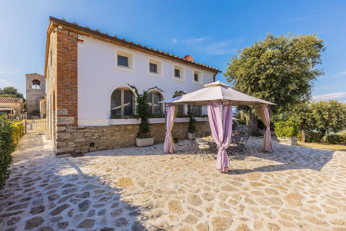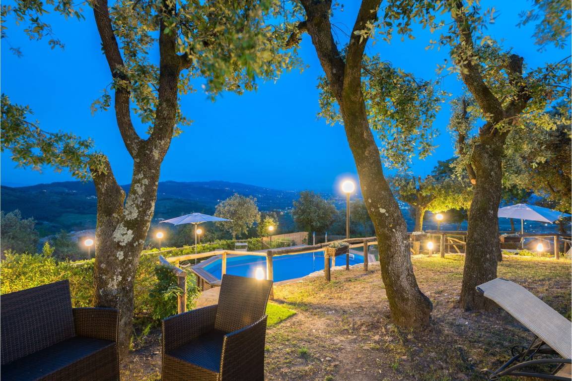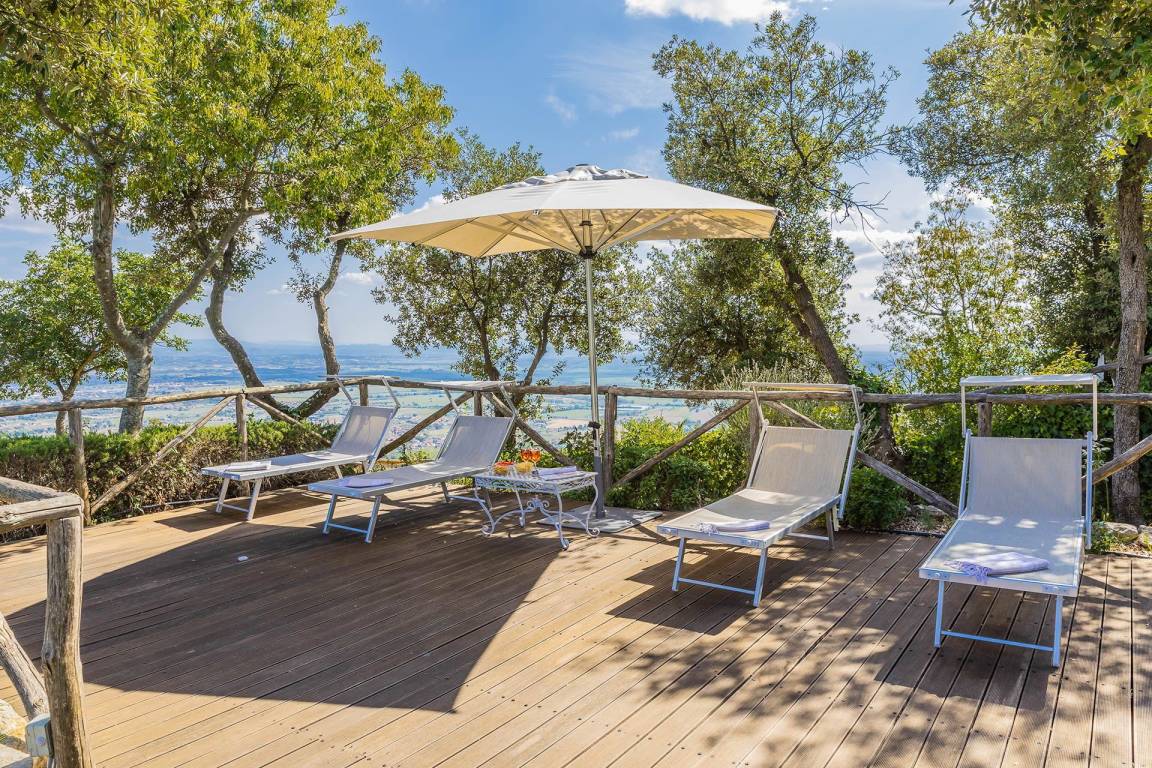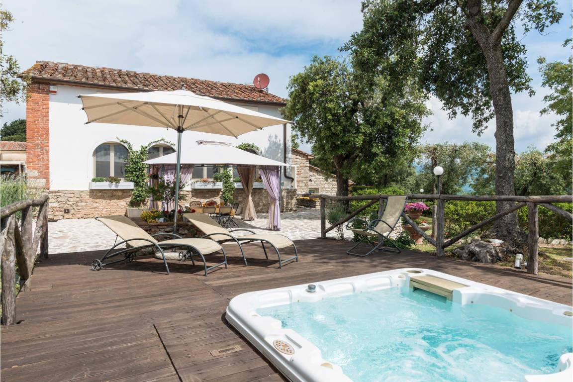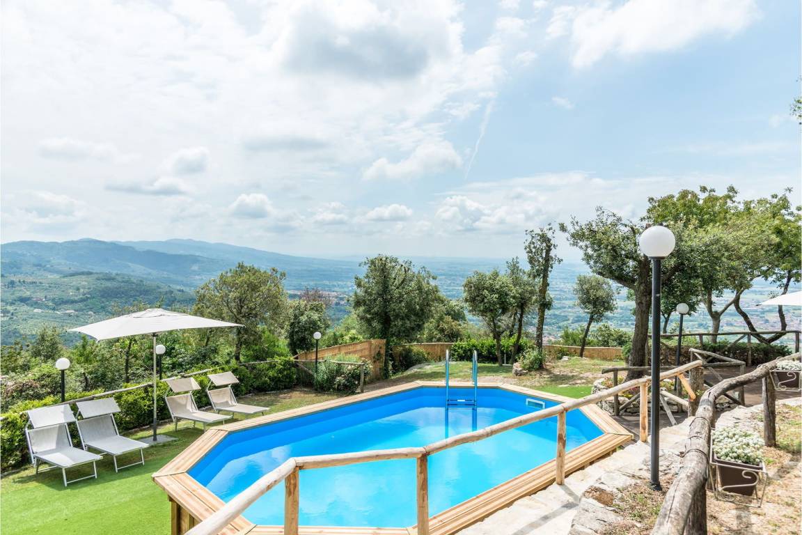 Die Villa liegt auf einem Hügel in der Toskana und bietet Panoramablicke auf die umliegende Landschaft. Ein privater Pool ist vorhanden.