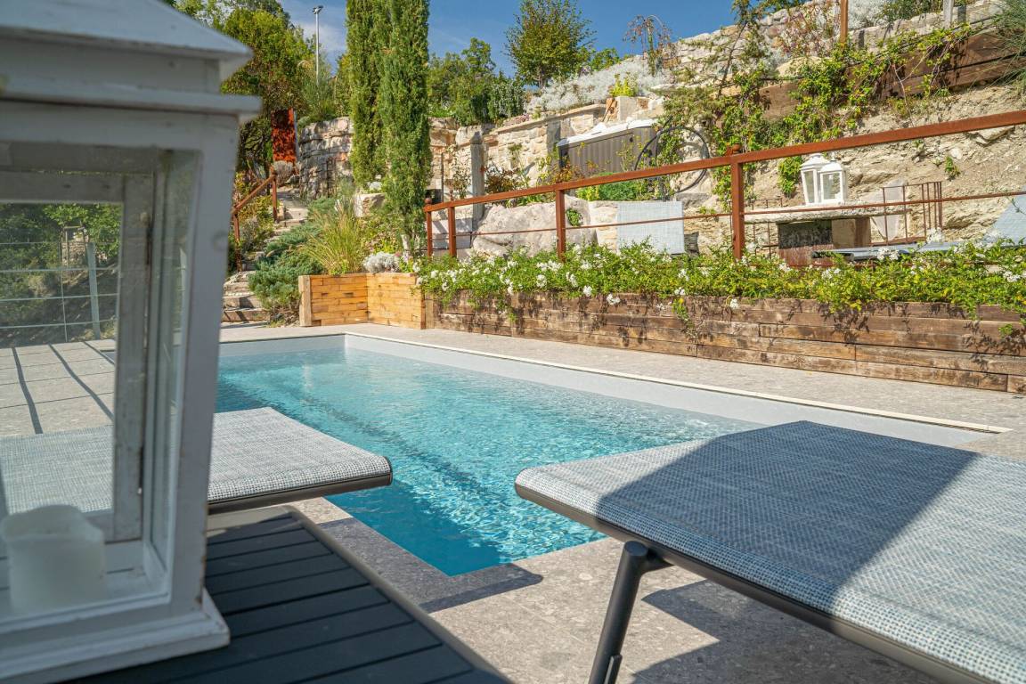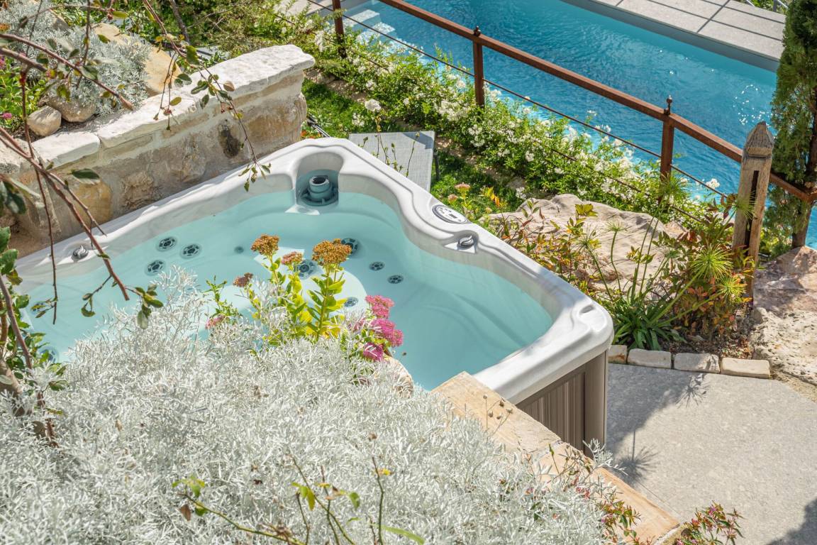 Garten: Schwimmbad (privat, Breite: 7m, Länge: 2.5m, Tiefe: 1.4m, Außen), Heißwasser-Whirlpool im Freien, Dusche, Grill, Außenbereich für das Essen im Freien, zwei Esstische (Personen: 10), Gartenmöbel, Sonnenliege.