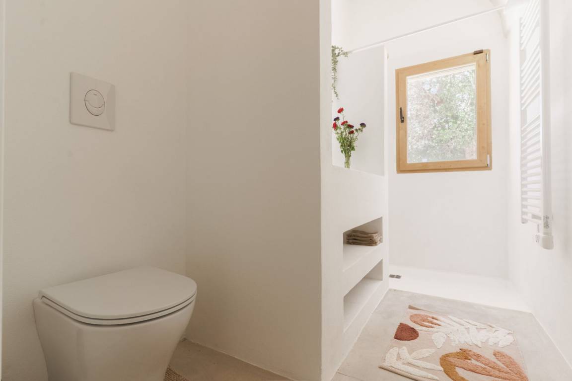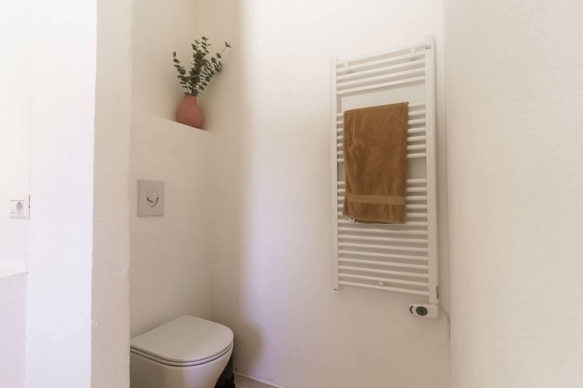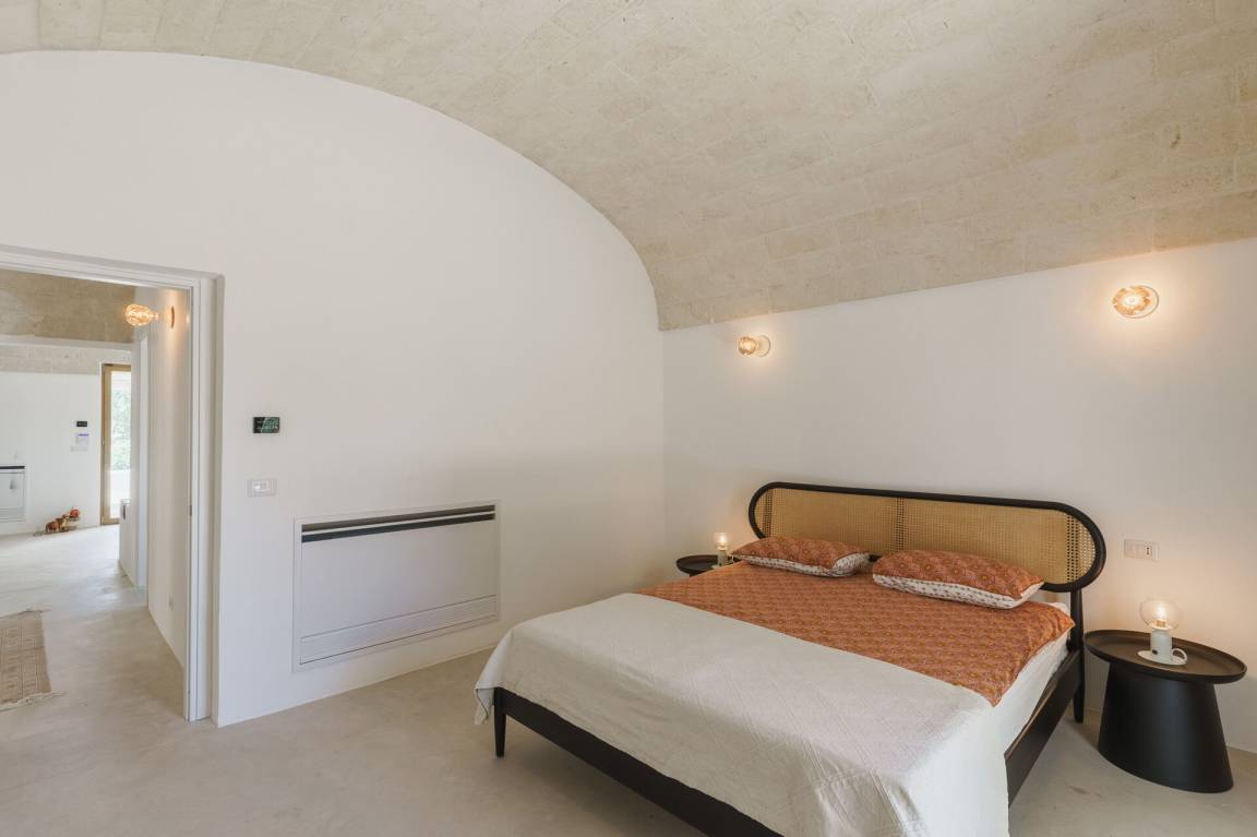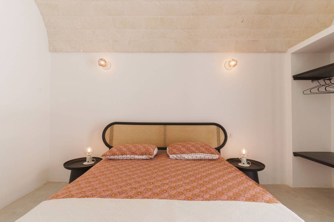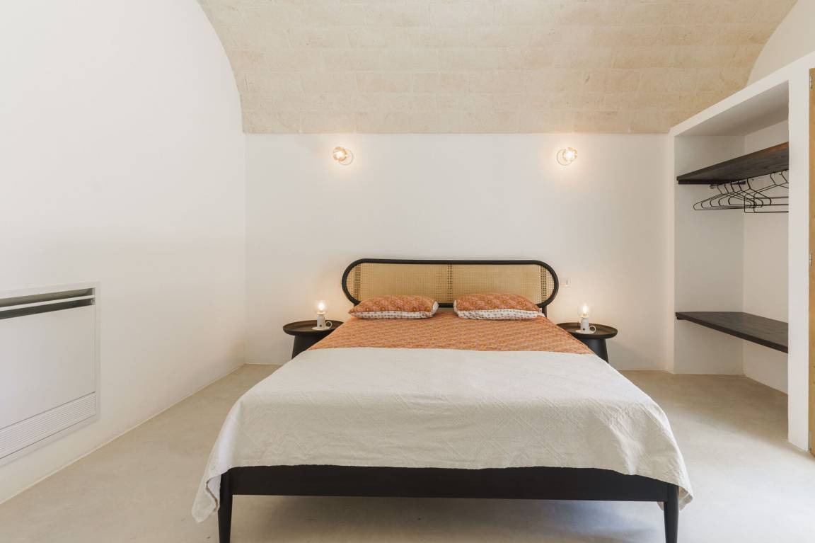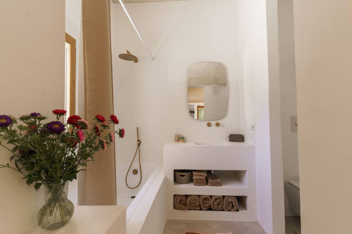Schlafzimmer mit Bad: Doppelbett, Klimaanlage, Waschbecken, WC, Badewanne, Ausgang auf den Garten.