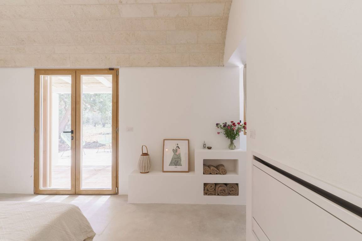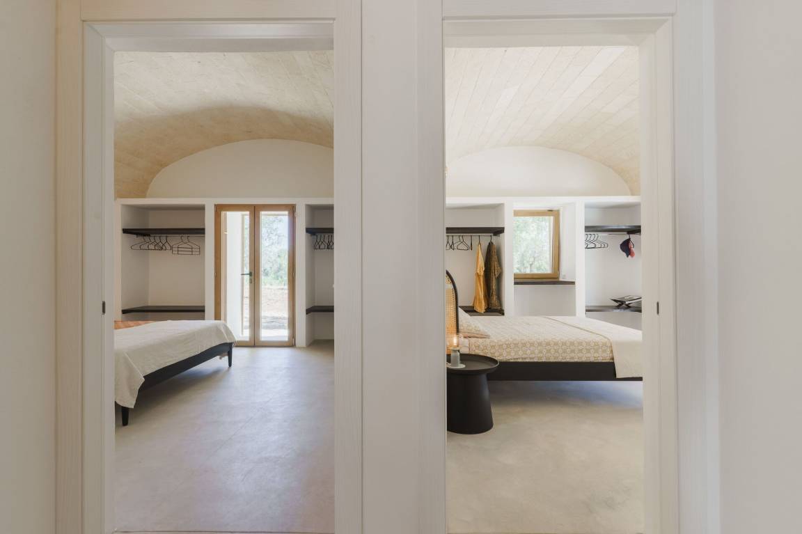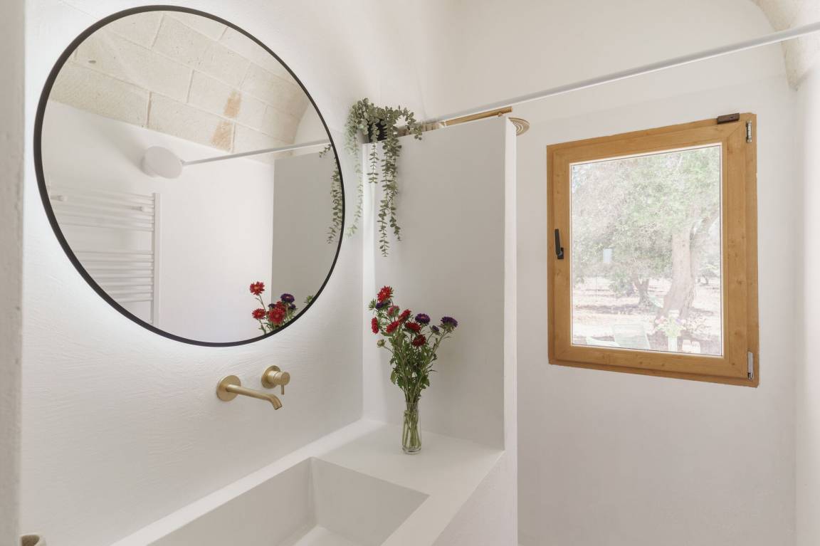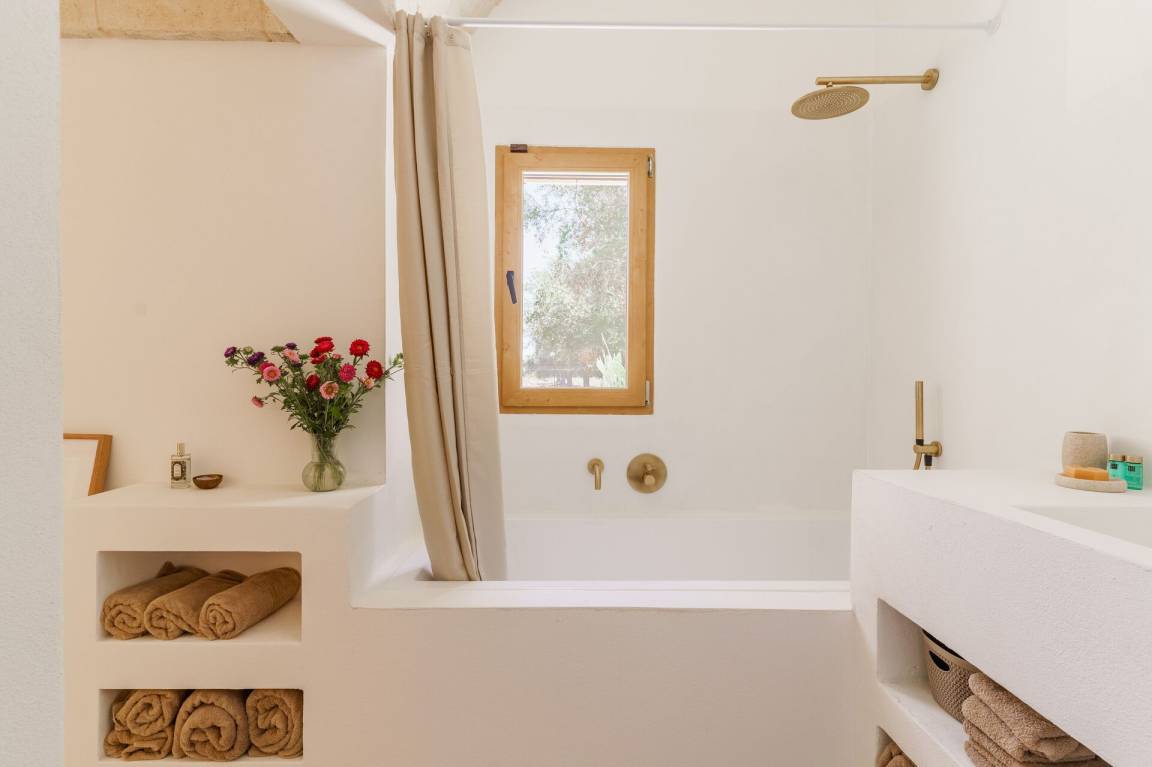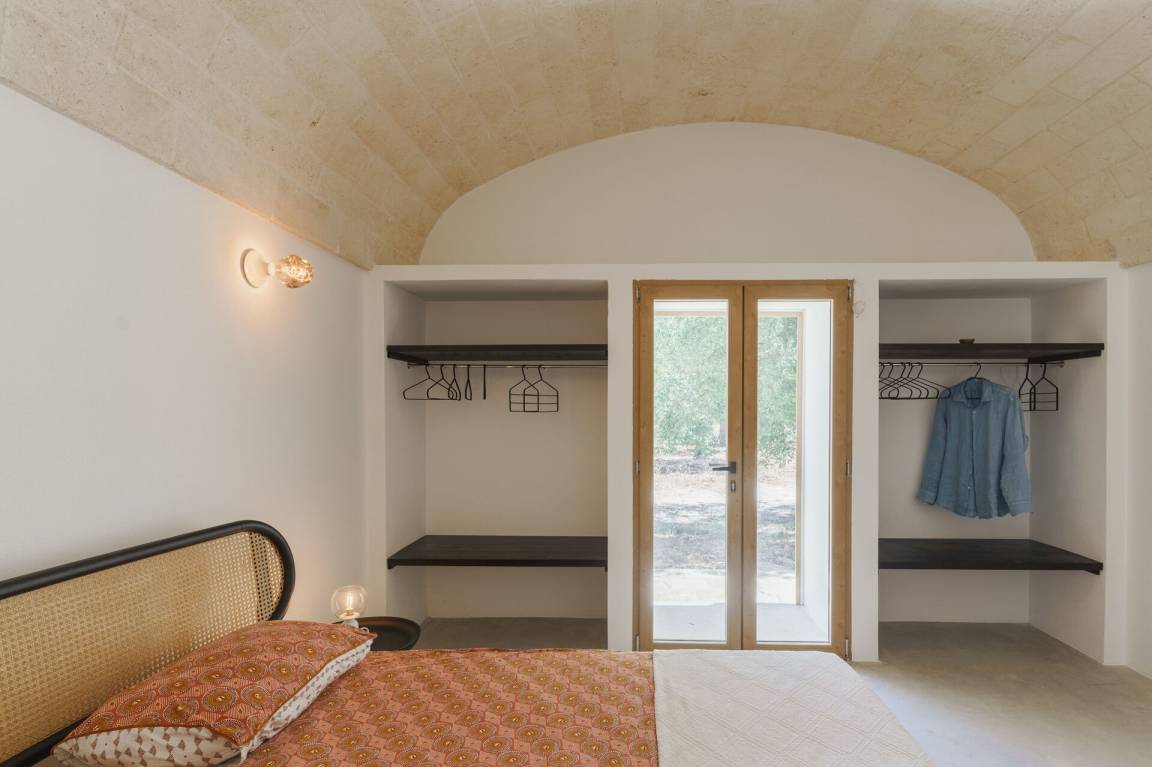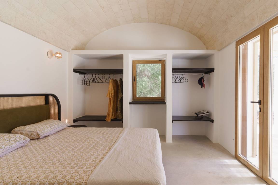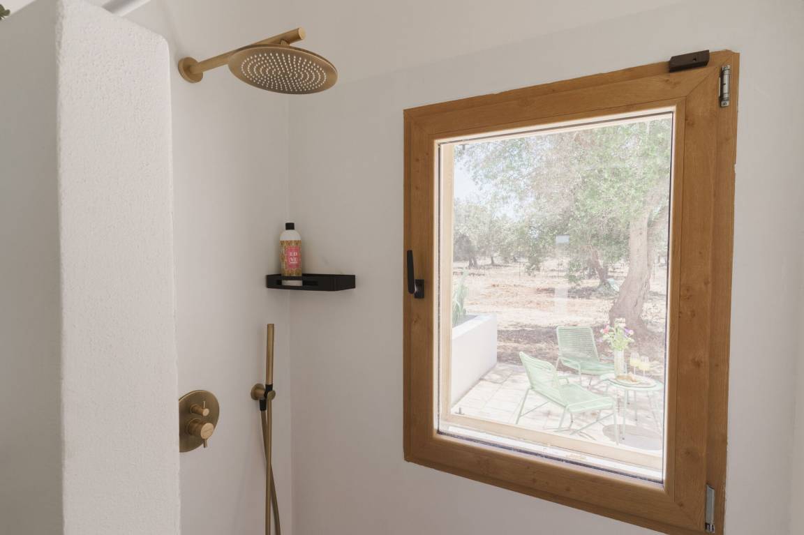Schlafzimmer mit Bad: Doppelbett, Klimaanlage, Waschbecken, WC, Badewanne, Ausgang auf den Garten.