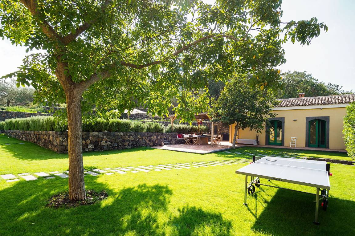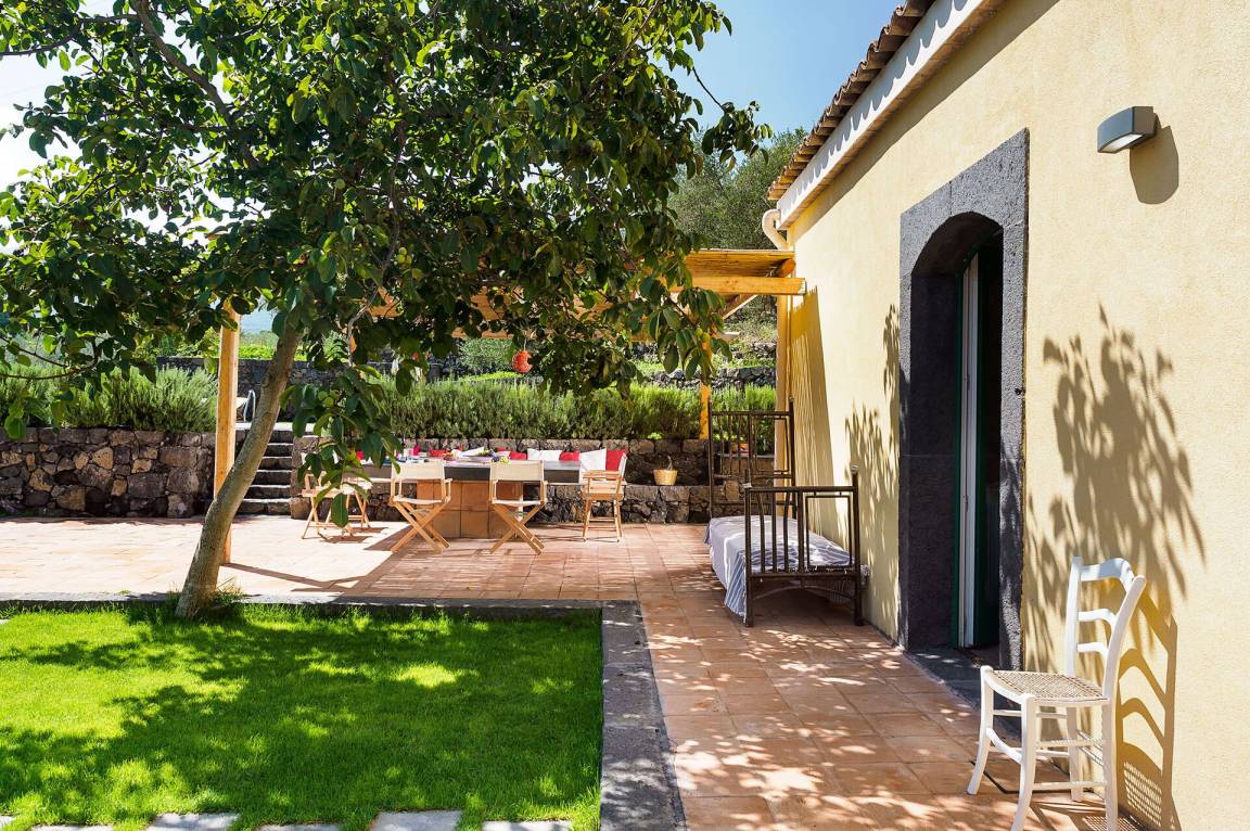 Wohnzimmer: zwei Sofas (Personen: 6), Kamin, Esstisch (Personen: 6), WiFi Internet, Internet, Klimaanlage, TV, Ausgang auf den Garten.