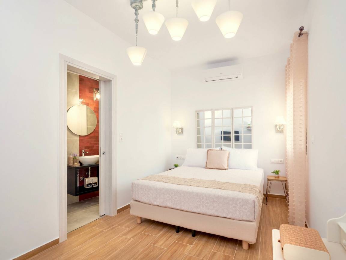 Schlafzimmer mit Bad 1: Doppelbett, Klimaanlage, Waschbecken, WC, Dusche, Badezimmer ohne Fenster, Ausgang auf die Terrasse.