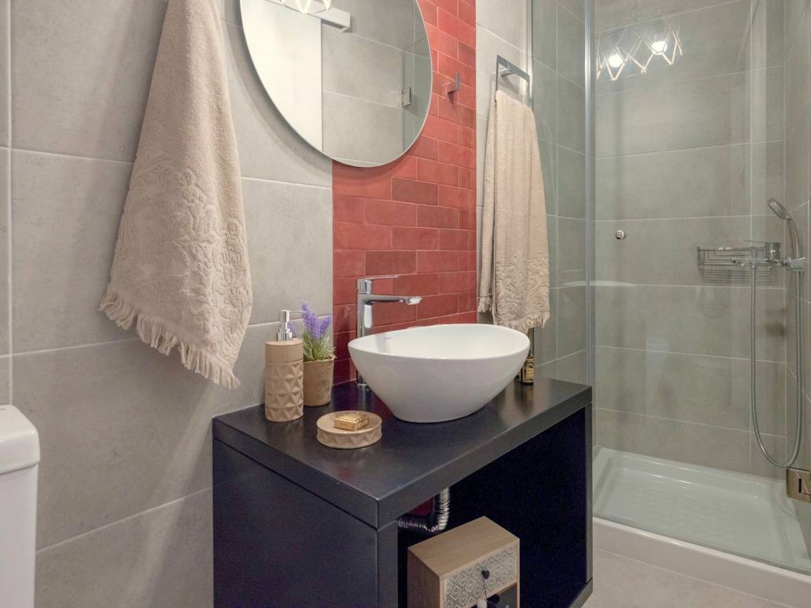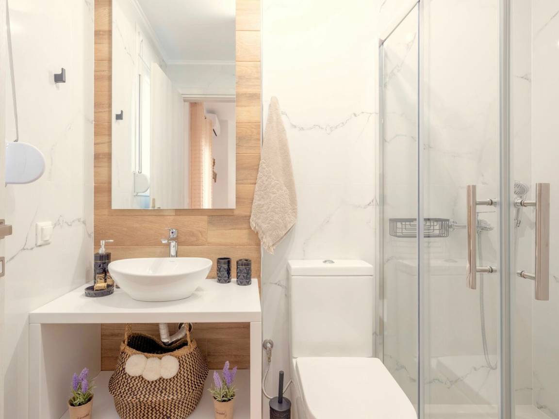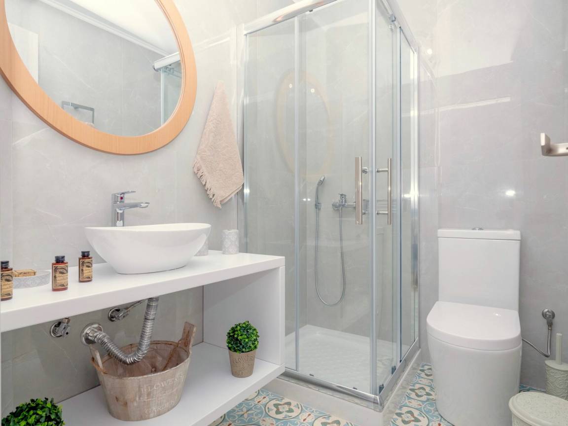Schlafzimmer mit Bad 2: Doppelbett, Klimaanlage, Waschbecken, WC, Dusche, Badezimmer ohne Fenster, Ausgang auf die Terrasse.
