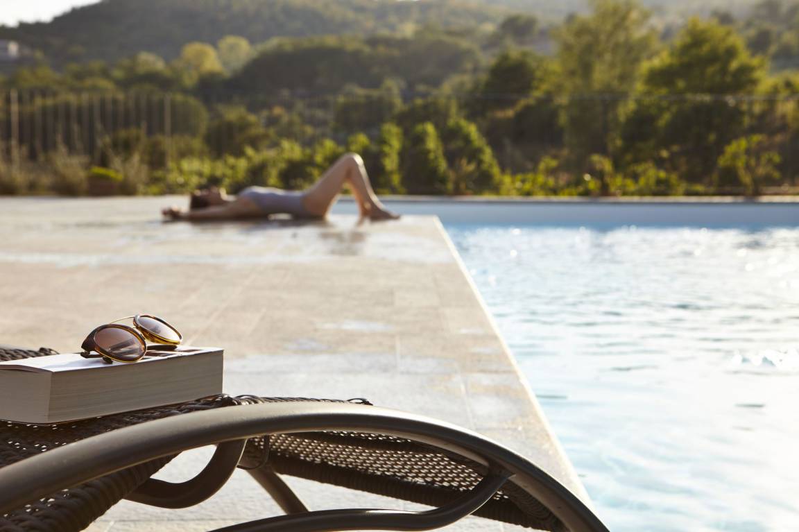 Draußen kann man Tische zusammenstellen, um gemeinsam zu essen - im Bereich des Gartens mit Blick auf den Swimming-Pool.