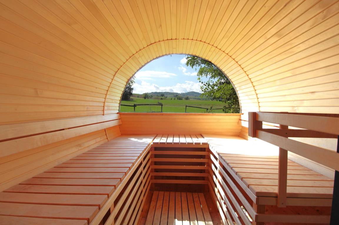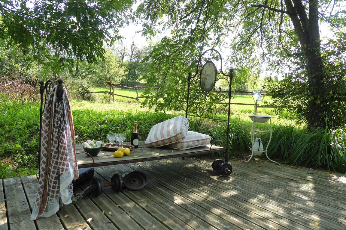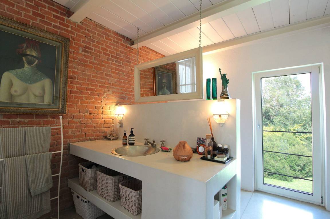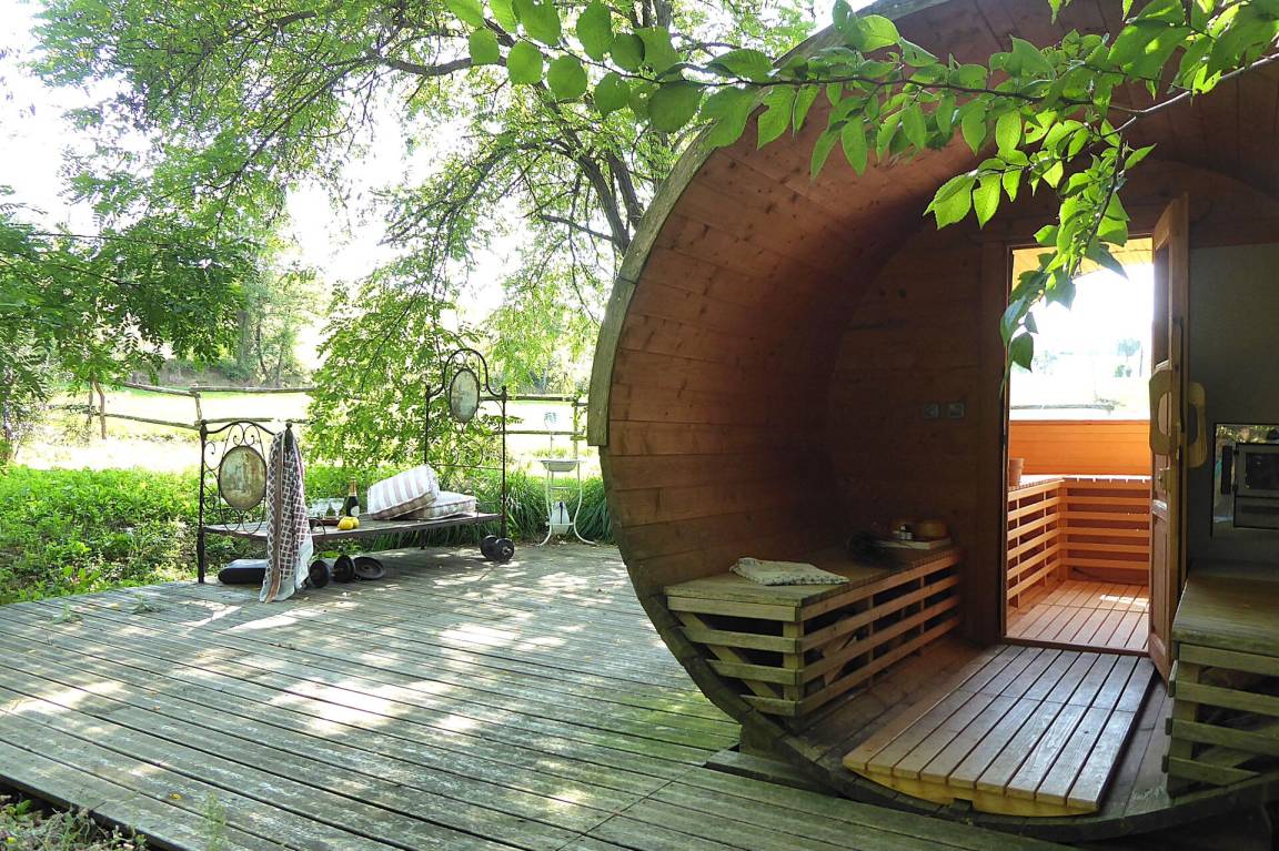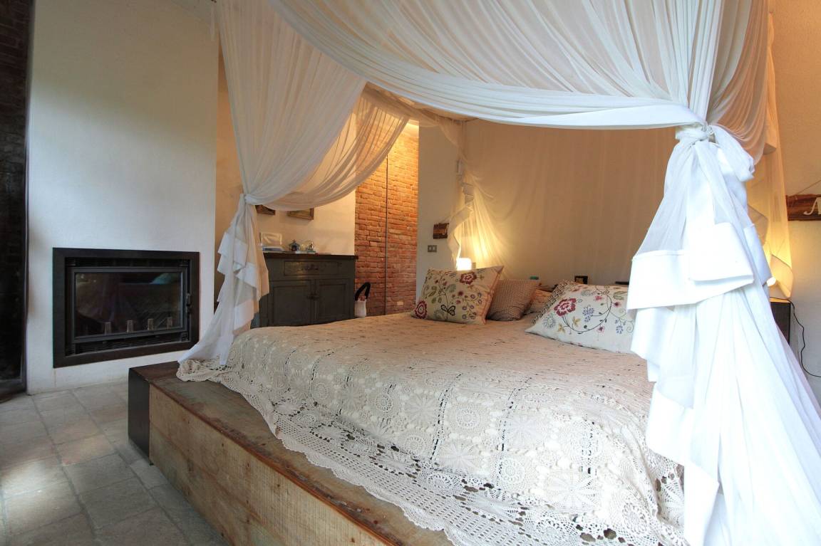 Schlafzimmer mit Bad: Doppelbett, WiFi Internet, Waschbecken, WC, Bidet, Dusche, Ausgang auf den Garten.