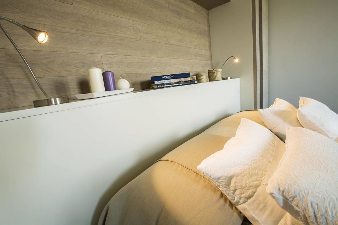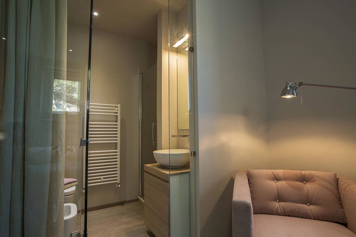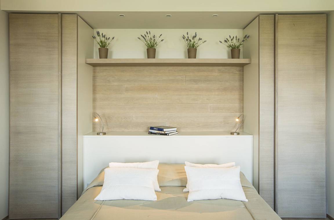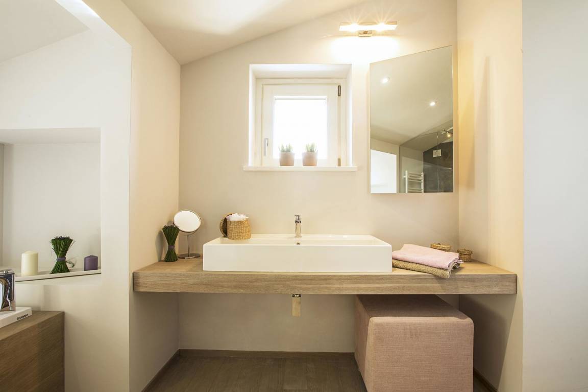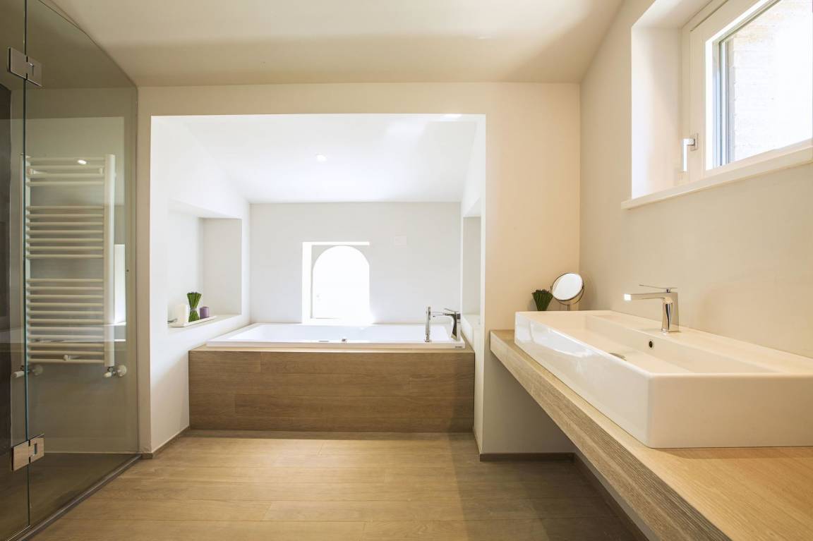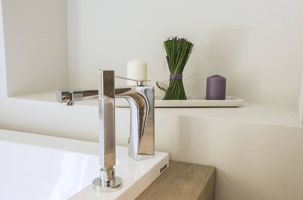 Schlafzimmer mit Bad 2: Doppelbett, WiFi Internet, Klimaanlage, Sessel, Schreibtisch, Waschbecken, WC, Bidet, Badewanne, Dusche, Fön, Ausgang auf die Terrasse.