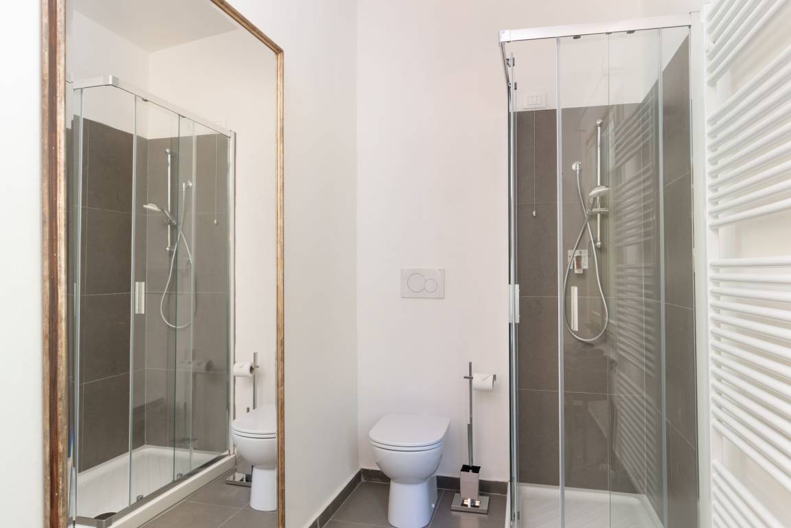 Badezimmer: Waschbecken, WC, Bidet, Dusche.