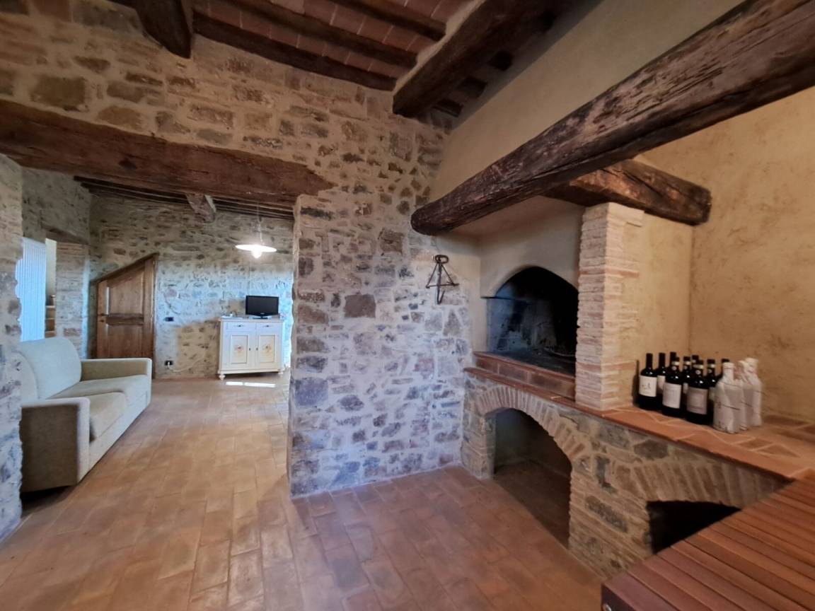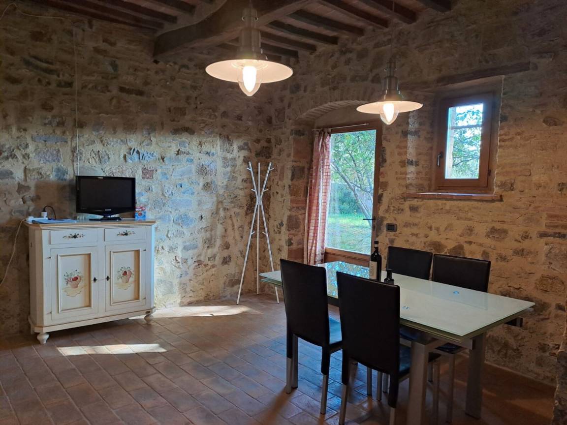 b>Erdgeschoss: Eingang, Toilette mit Waschmaschine, Wohnzimmer mit Essbereich und Doppelschlafsofa und Ausgang zum privaten und ausgestatteten Außenbereich, Hauswirtschaftsraum, Einbauküche mit Kamin (Geschirrspüler, Backofen, Kaffeemaschine, Wasserkocher, Herd, Kühlschrank, Gefrierschrank, Toaster).