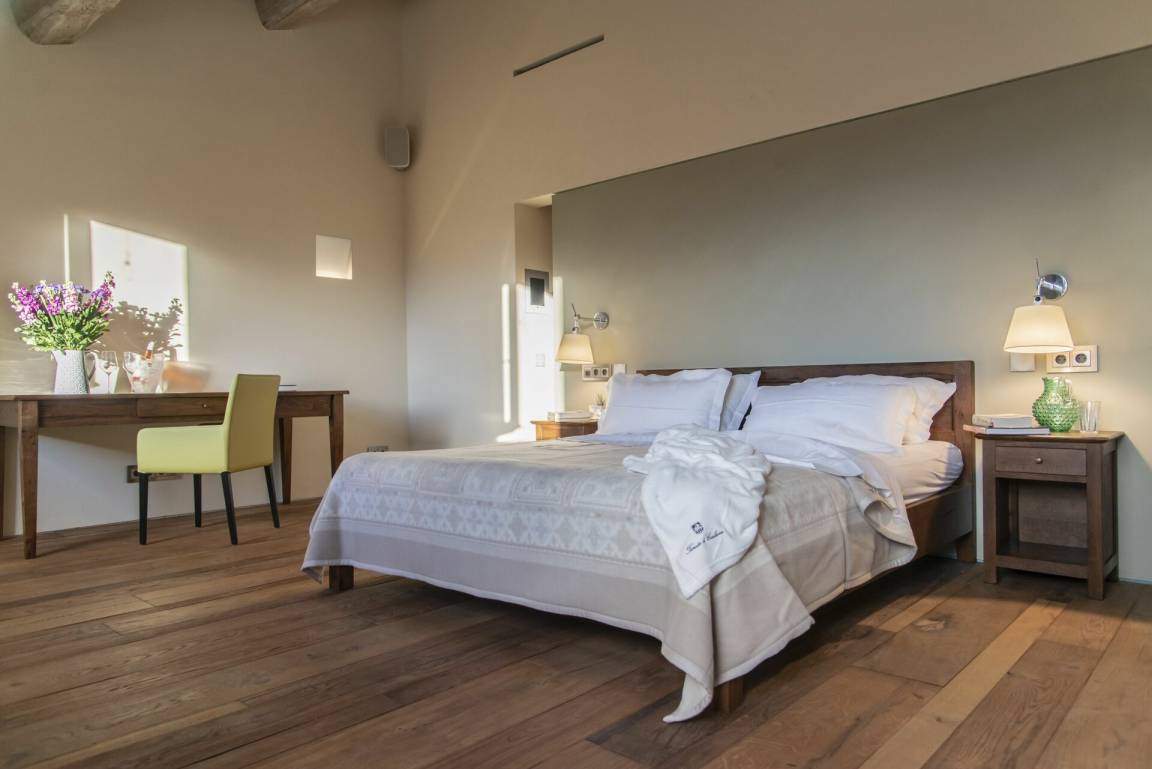 Schlafzimmer mit Bad 4: Doppelbett, WiFi Internet, Klimaanlage, Sessel, Schreibtisch, Waschbecken, WC, Bidet, Dusche.
