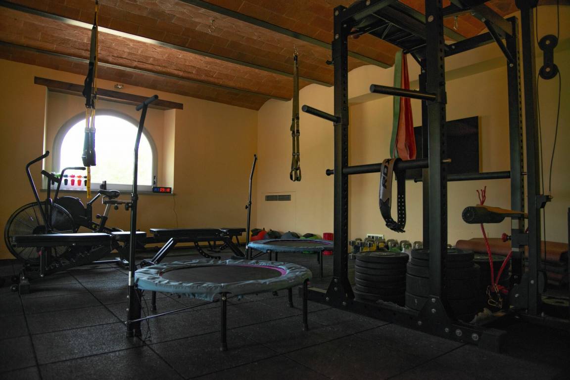 Fitnessraum: Fitnessgeräte, Sauna, Dusche, TV.