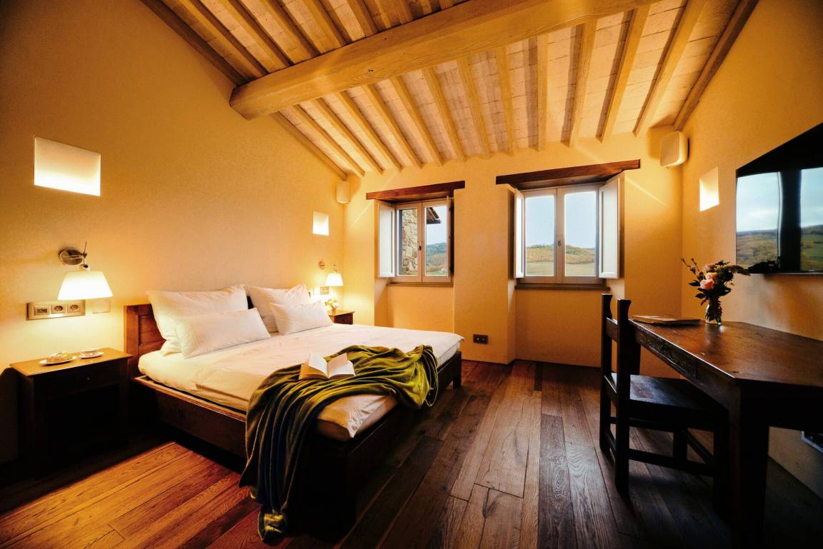 Schlafzimmer mit Bad 5: Doppelbett, WiFi Internet, Klimaanlage, Sessel, Schreibtisch, Waschbecken, WC, Bidet, Dusche.