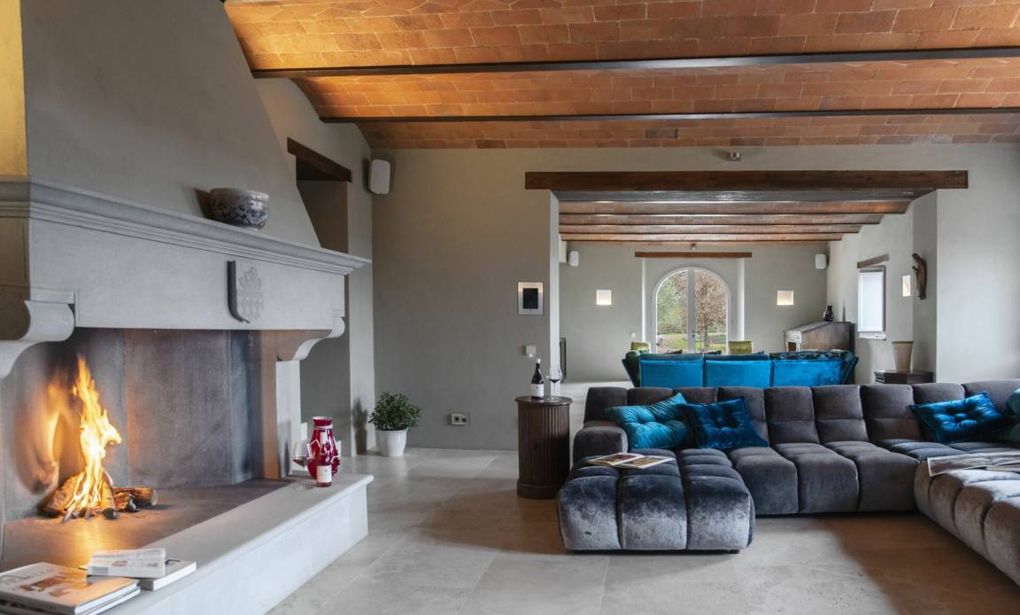 Wohnzimmer: Sofa, Sessel, Kamin, WiFi Internet, Klimaanlage, Satelliten-TV.