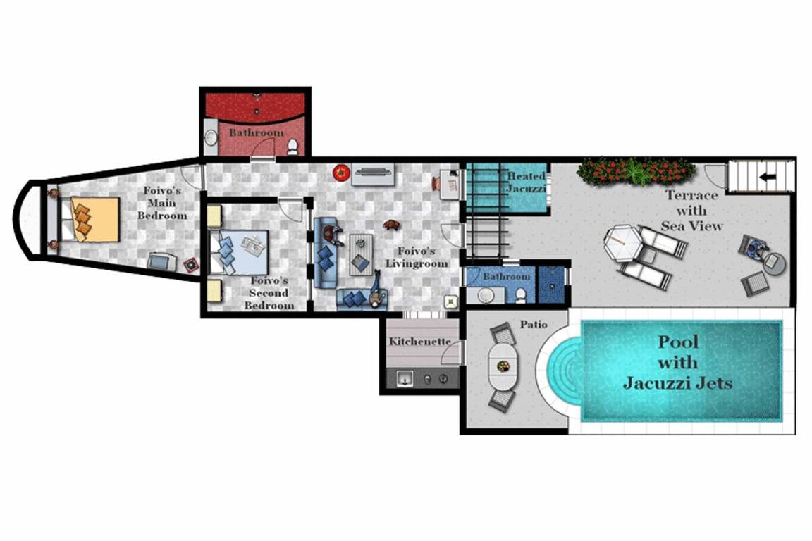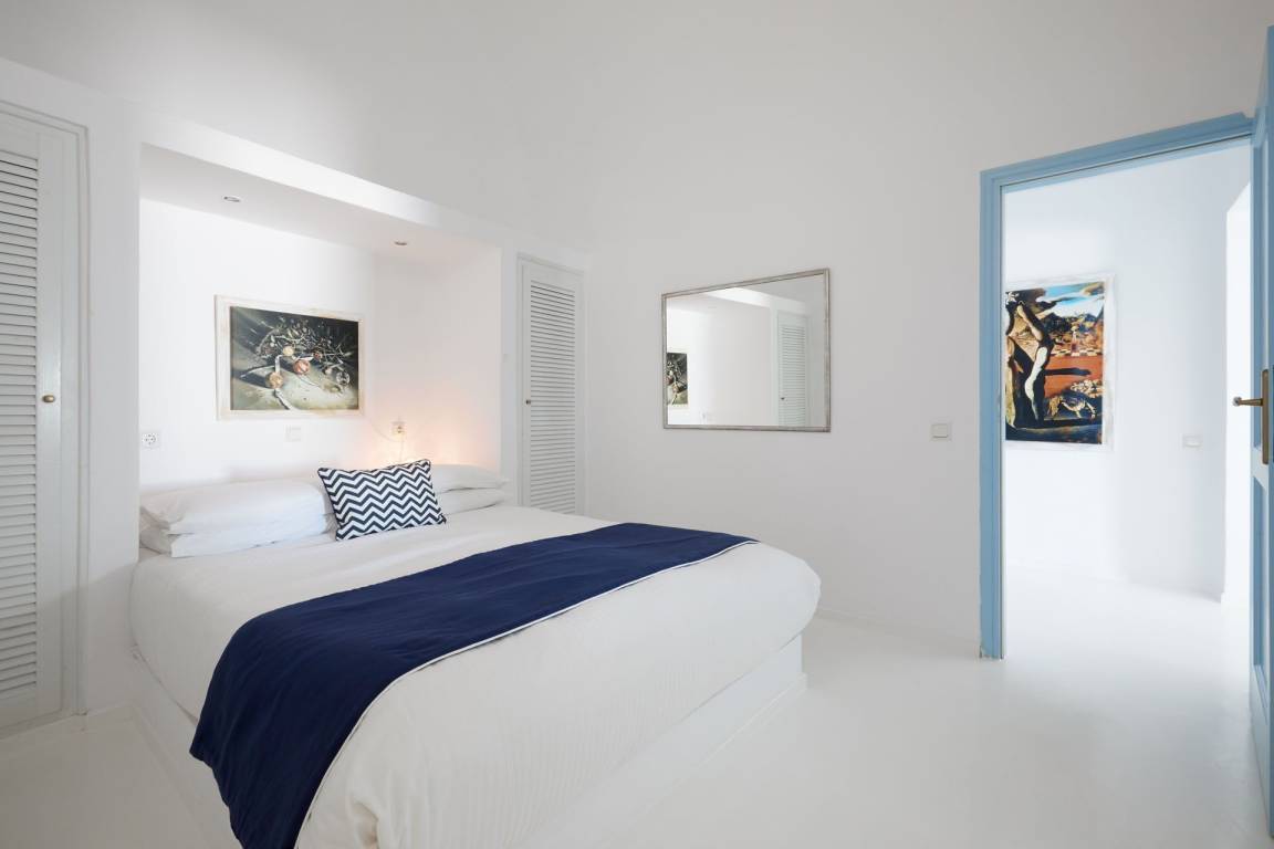Die Villa verfügt über eine Gesamtfläche von etwa 150 Quadratmetern, verteilt auf zwei Ebenen, und bietet Platz für bis zu 5 Gäste. Die Unterkunft umfasst 2 Schlafzimmer und 2 Bäder. Im Erdgeschoss befinden sich die Wohnbereiche mit offenen, luftigen Räumen, die nahtlos zu den Außenbereichen übergehen. Das erste Obergeschoss beherbergt die 2 Schlafzimmer, von denen jedes mit sorgfältig ausgewählten Möbeln eingerichtet ist und Meerblick bietet. Ein Bad ist mit einer Badewanne mit Whirlpool-Funktion ausgestattet, das zweite Bad mit einer Dusche. Die Raumaufteilung ermöglicht einen natürlichen Fluss zwischen den Innenräumen und den Außenbereichen.