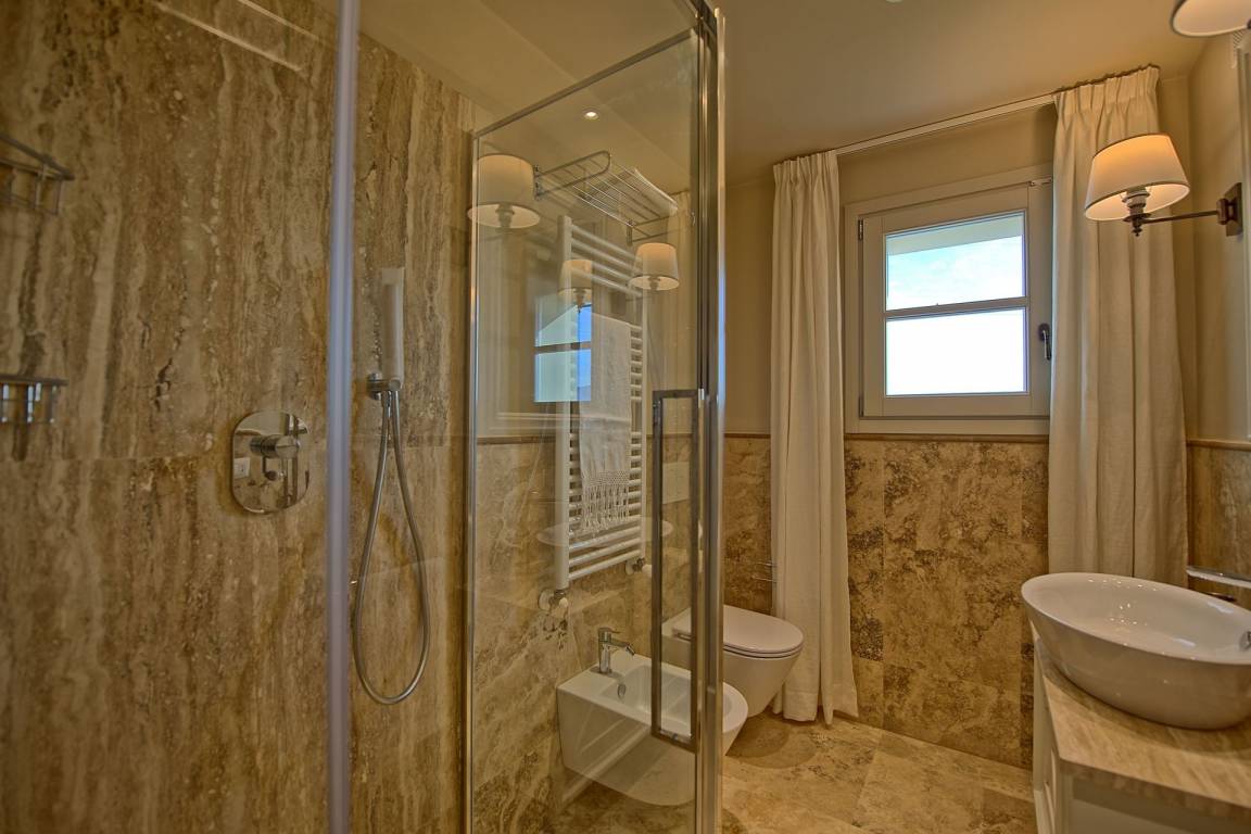 Badezimmer: Waschbecken, WC, Bidet, Dusche.