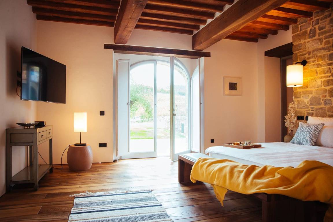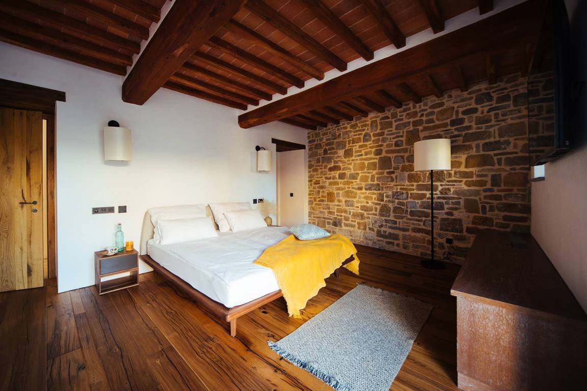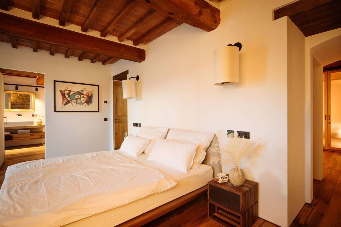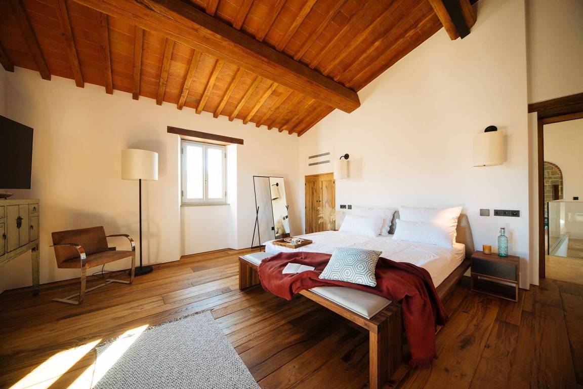 Das Erdgeschoss umfasst einen großzügigen Wohnbereich mit Sofas und einem Kamin mit offenem Herd, einen separaten Essbereich, eine vollständig ausgestattete Küche mit Elektroherd, Mikrowelle, Toaster, Kaffeemaschine, Kühl-Gefrierkombination und Eismaschine. Ein Studio mit Schlafsofa bietet flexible Schlafmöglichkeiten. Ein Gästezimmer mit eigenem Bad mit Dusche ist vorhanden. Zwei große Schlafzimmer mit jeweils eigenem Bad mit Dusche, Safe, begehbarem Kleiderschrank und Satellitenfernsehen befinden sich ebenfalls auf dieser Ebene. Das Erdgeschoss wird durch einen ursprünglichen Turm geprägt, von dem aus die Landschaften der Toskana sichtbar sind.