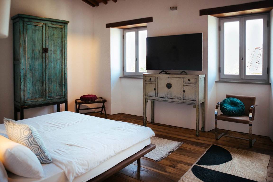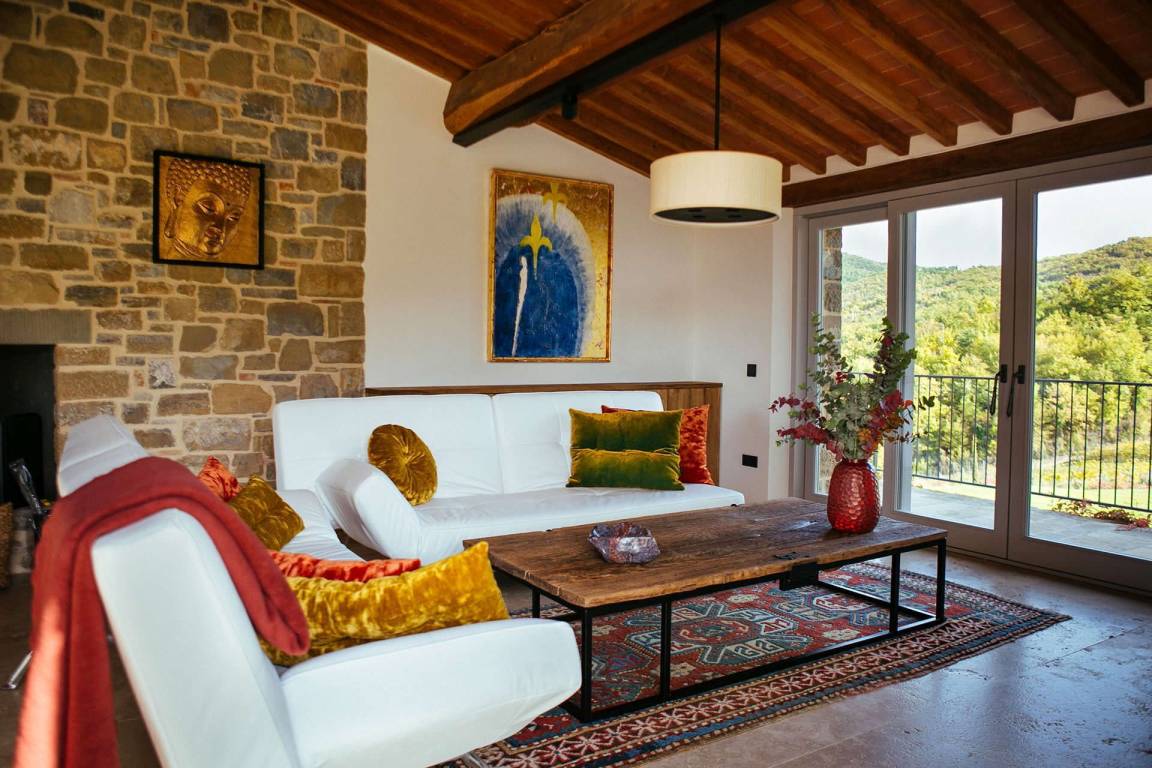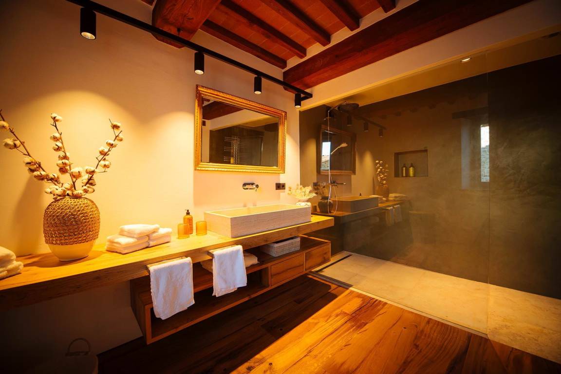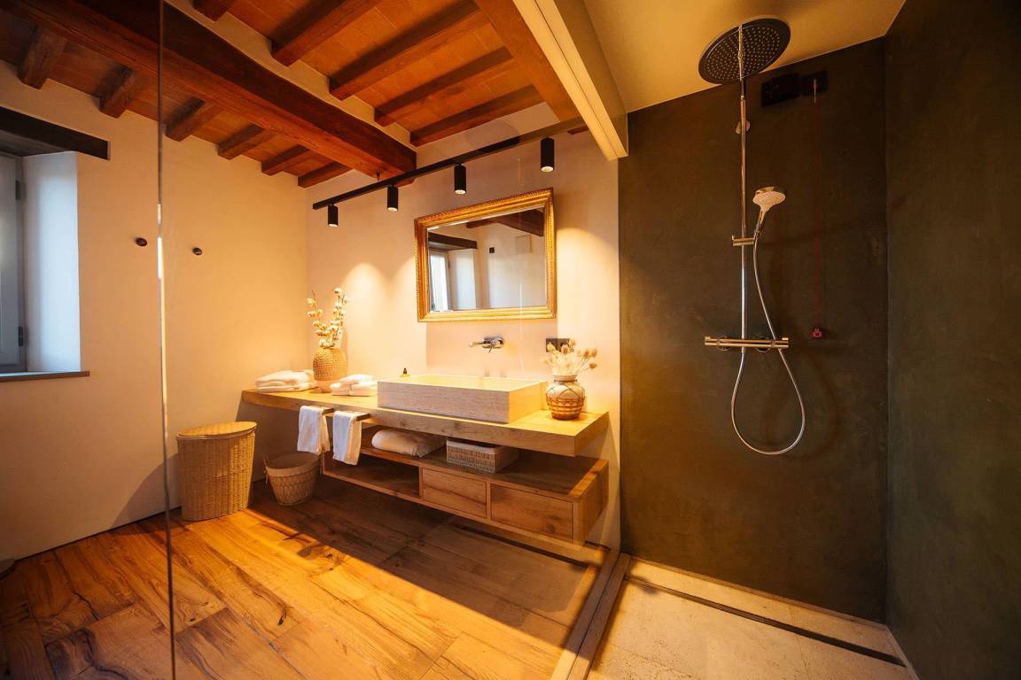 Das Erdgeschoss umfasst einen großzügigen Wohnbereich mit Sofas und einem Kamin mit offenem Herd, einen separaten Essbereich, eine vollständig ausgestattete Küche mit Elektroherd, Mikrowelle, Toaster, Kaffeemaschine, Kühl-Gefrierkombination und Eismaschine. Ein Studio mit Schlafsofa bietet flexible Schlafmöglichkeiten. Ein Gästezimmer mit eigenem Bad mit Dusche ist vorhanden. Zwei große Schlafzimmer mit jeweils eigenem Bad mit Dusche, Safe, begehbarem Kleiderschrank und Satellitenfernsehen befinden sich ebenfalls auf dieser Ebene. Das Erdgeschoss wird durch einen ursprünglichen Turm geprägt, von dem aus die Landschaften der Toskana sichtbar sind.