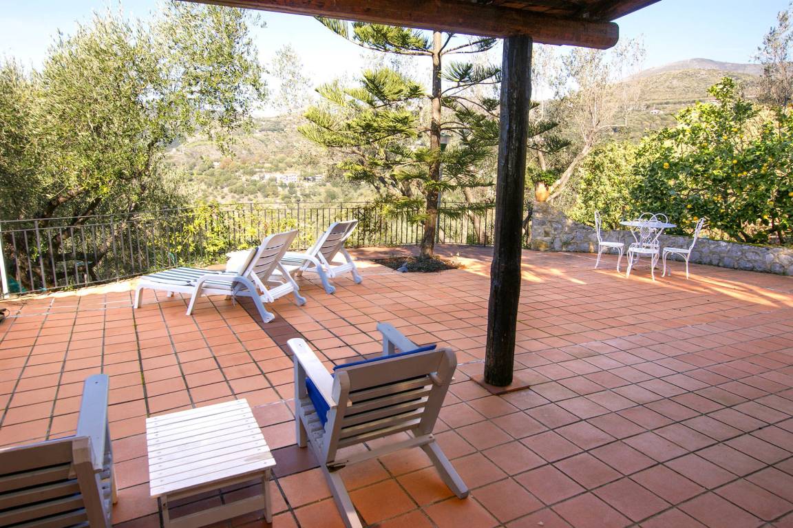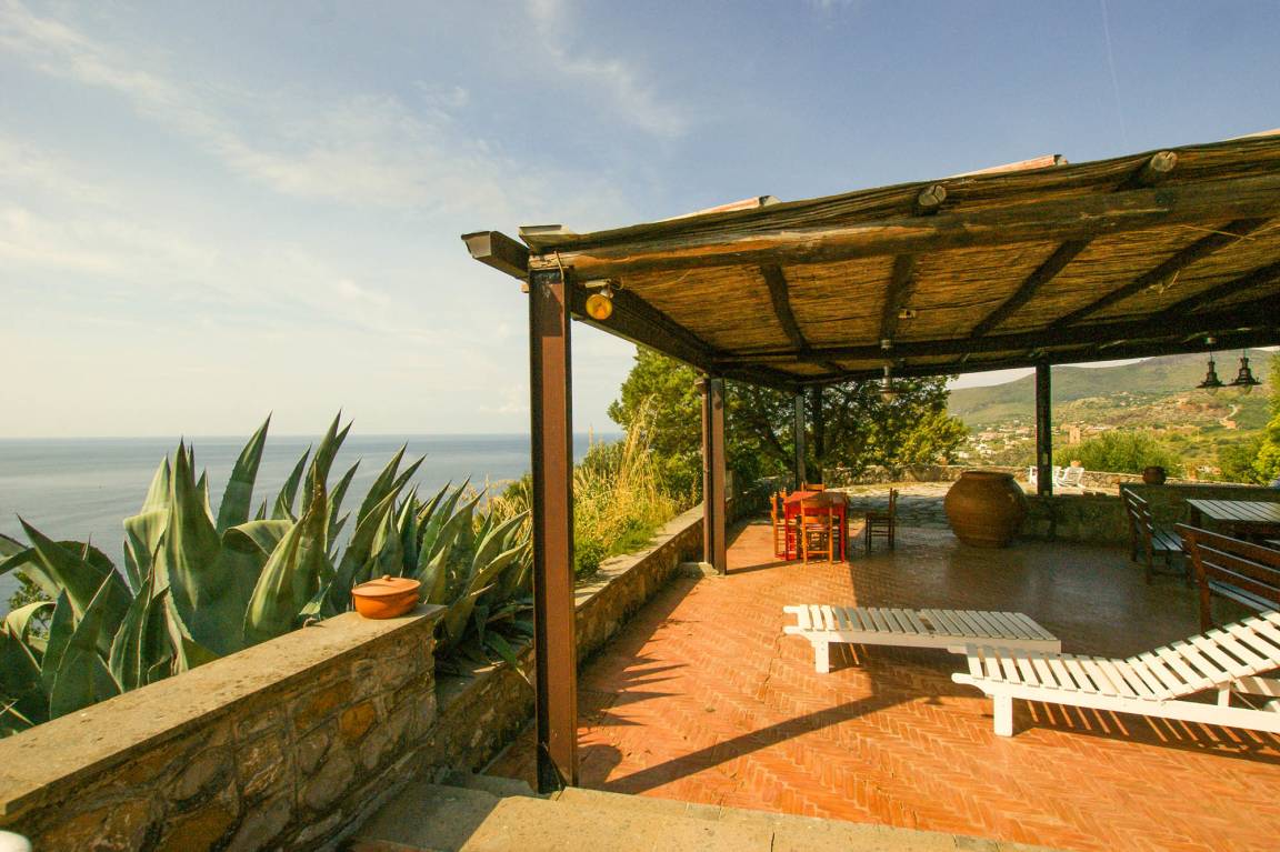 From the large terrace for shared use on the property, you have got the best view of the sea, of Lentiscelle beach only 400 m off and of Marina di Camerota. There is a stone pizza oven on this terrace as well as a small outdoor kitchen, where you can prepare your 'pizza evening' with a fantastic view of the Tyrrhenian Sea and the Saracen tower at your feet.