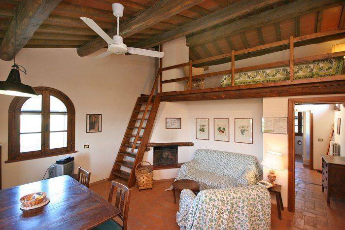 2. Stock:Wohnzimmer (Satellitenfernsehen) mit Kamin, Ess- und Kochecke (Ofen, Orangen- Zituspresse, Gefrierfach), offene Galerie mit Doppelschlafcouch, Doppelzimmer, Bad mit Dusche.