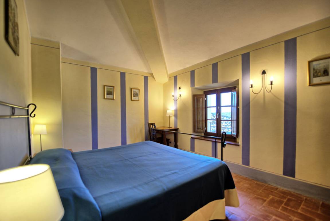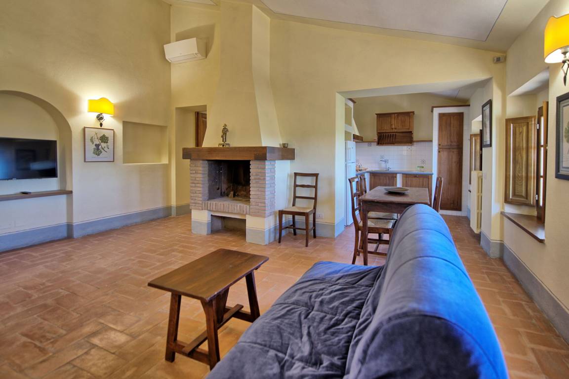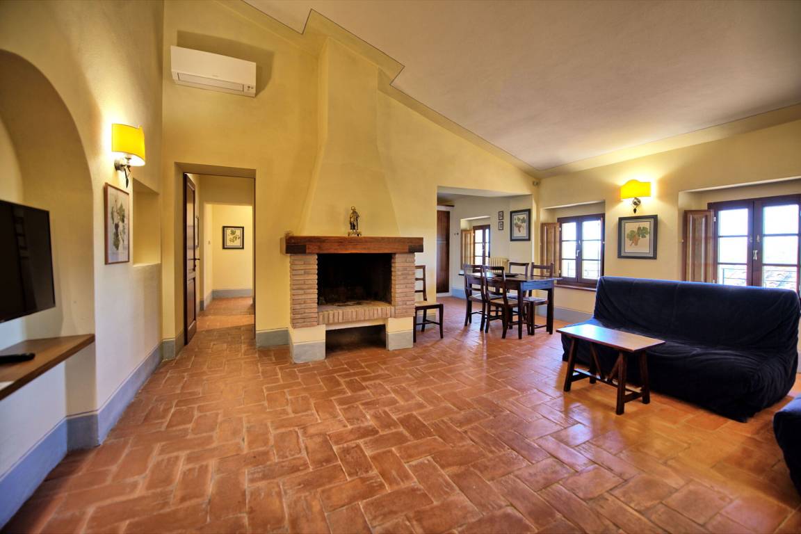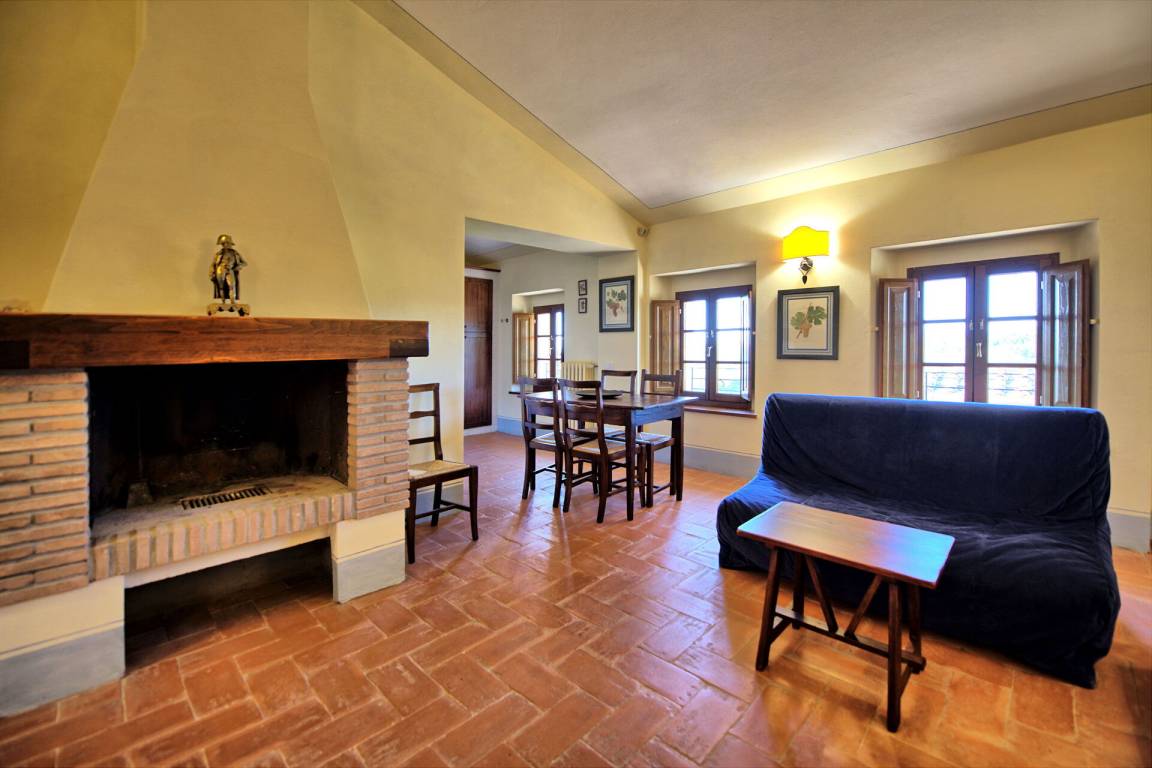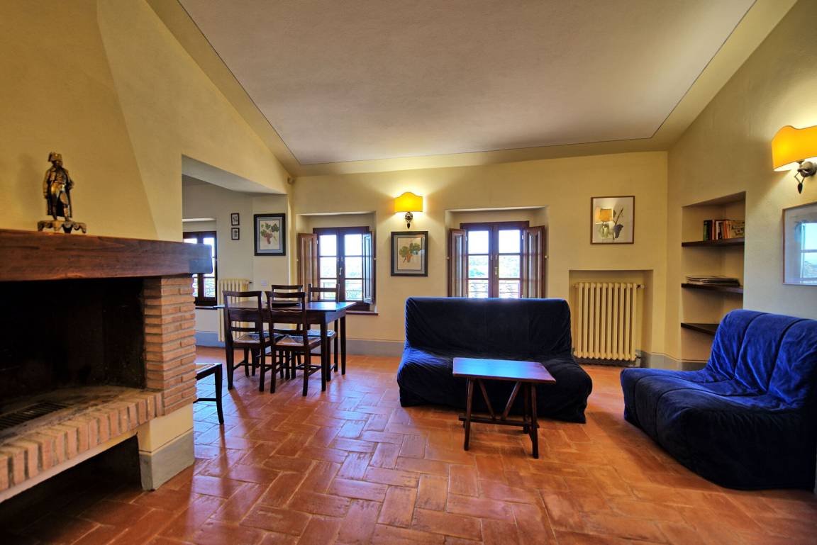 Vom Wohnzimmer aus hat man einen schönen Blick auf die Landschaft und in der Ferne auf die Stadt Siena.