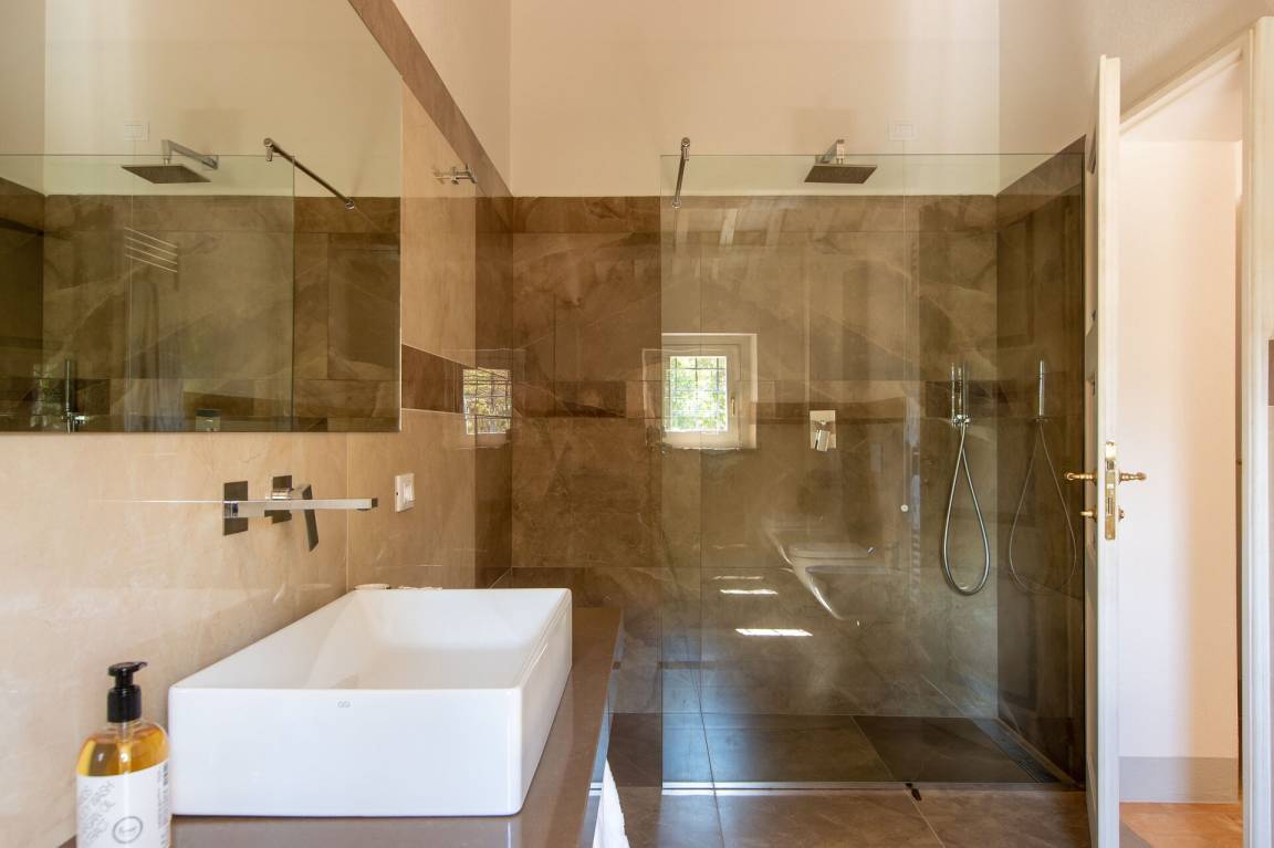 Erster Stock: 2 Doppelzimmer mit Ehebett (Kingsize-Bett) jeweils mit Klimaanlage und eigenem Bad mit Dusche, 2 Doppelzimmer jeweils mit Klimaanlage und eigenem Bad mit Dusche.