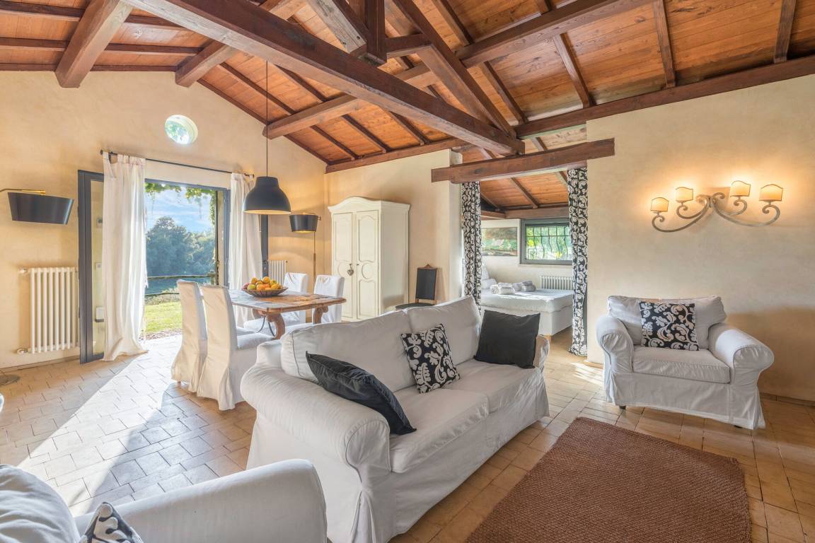 Wohnzimmer: Sessel, Kamin, Esstisch, Doppel-Schlafsofa, WiFi Internet, Satelliten-TV, Ausgang auf den Garten.