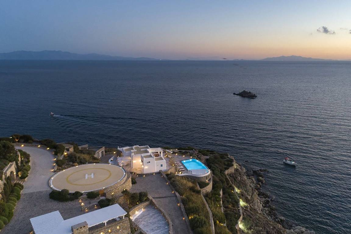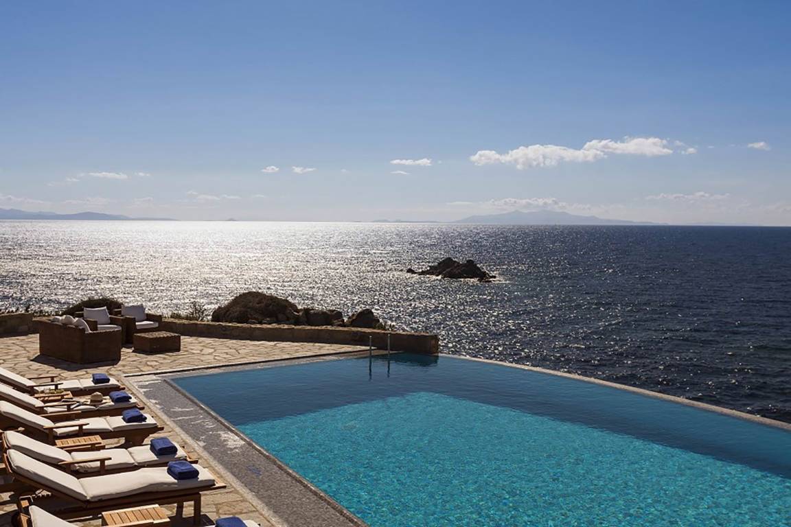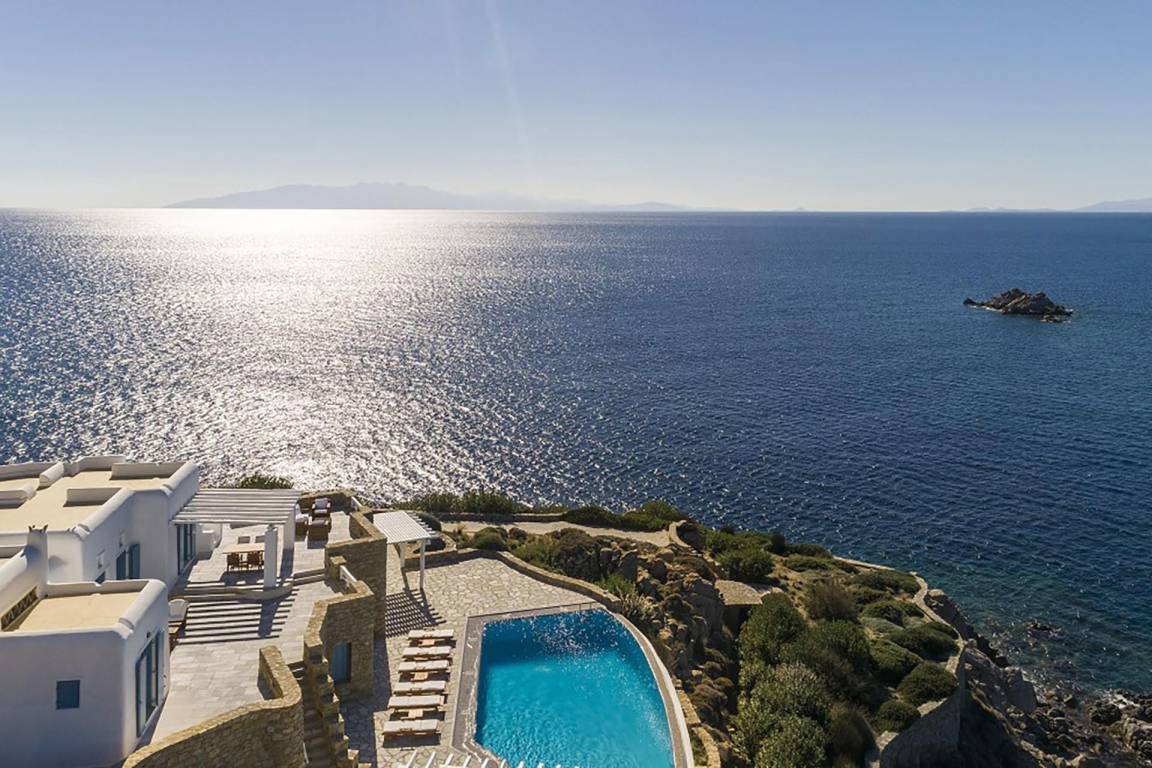 Die Villa verfügt über einen Infinity-Pool mit Panoramablick auf die benachbarten Inseln und die Ägäis.